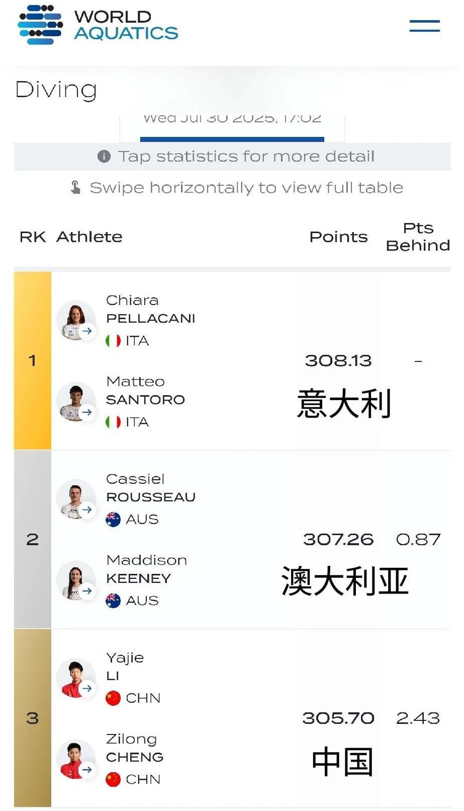2.43分,史上跳水比赛前三名之间的最小差距在2025年的新加坡诞生 世界泳联世锦赛跳水比赛中,意大利以0.87分的微弱优势战胜澳大利亚,赢得男女混合3米板跳水冠军。 Matteo Santoro成为自1975年以来第一位在周三的跳水比赛中赢得世界冠军头衔的意大利人-他与Chiara Pellacani在混合3米同步中做到了这一点。澳大利亚获得银牌,中国获得铜牌。从第一名到从第三名只有2.43分差距。