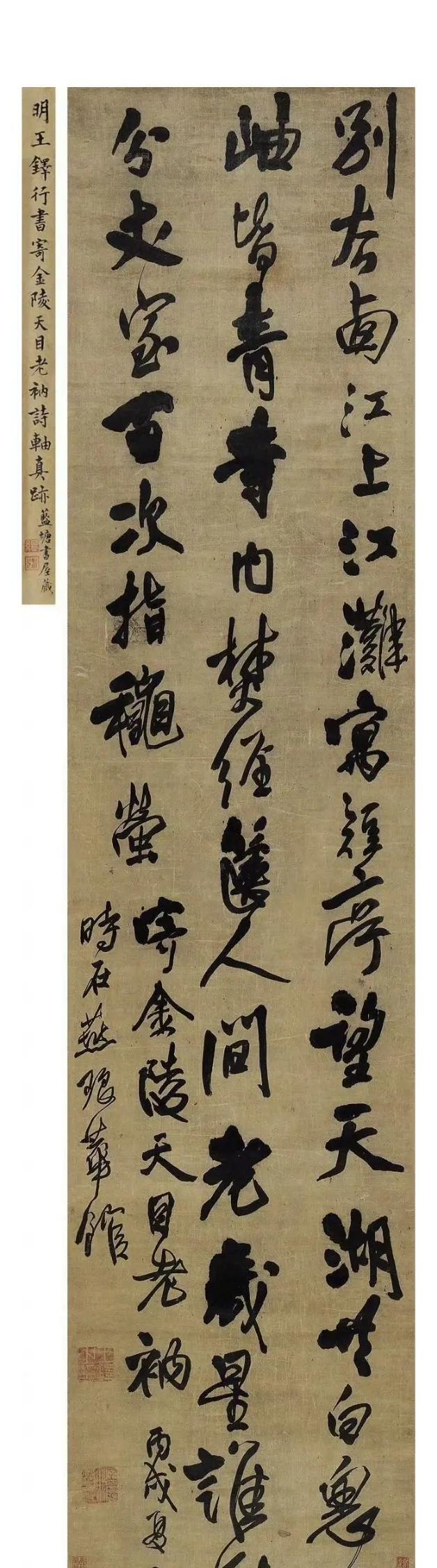 什么是书法创新?看看王铎书法! 近人学习书法动不动号称创新,在用纸、用墨上搞些小技巧号称创新,用车轮子瞎滚一气号称创新,射墨号称创新,有的人胡写一气,写完之后自己都不知道写了啥也号称创新,其实都是自欺欺人的杂耍而已! 真正的创新必须有真正的功力,学古而不泥,真正继承古典名家艺术又写出自己的风格才能叫创新! 如明代书法家王铎在书法上进行了突破性实践,认真学习古贤者二王、米芾,六十岁以狂草重写王羲之,笔锋如“带血迸溅”,曾因借得米芾真迹“夜怀不能寐”,临帖时融入个人狂草风格! 第二幅图是王铎《寄金陵天目老衲诗》:别去西江上,江滩寓短亭。望天湖共白,思子岫皆青。寺内焚经箧,人间老岁星。谁能分丈室,百次指秋萤。 这样的作品拥有强烈的视觉冲击力,艺术境界超凡脱俗,同时自王铎开始书法能写鸿篇巨制,超越书扎等小作品形式,给人以大的心灵感应,是真正的书法创新!