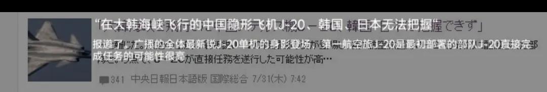 J20飞越对马海峡巡航,日韩的雷达完全未察觉,一脸懵B!这样的话,几架J20编队就可以在“国际水域”上空发射导弹摧毁他们的高价值目标! 泡菜媒体报导了这一消息,而两国军方都保持沉默,估计内心慌乱中。因为之前根本没发现过J20,就连一向尿性的倭国防卫省也从未报导过。 这是东大的权威央视军事披露的消息。