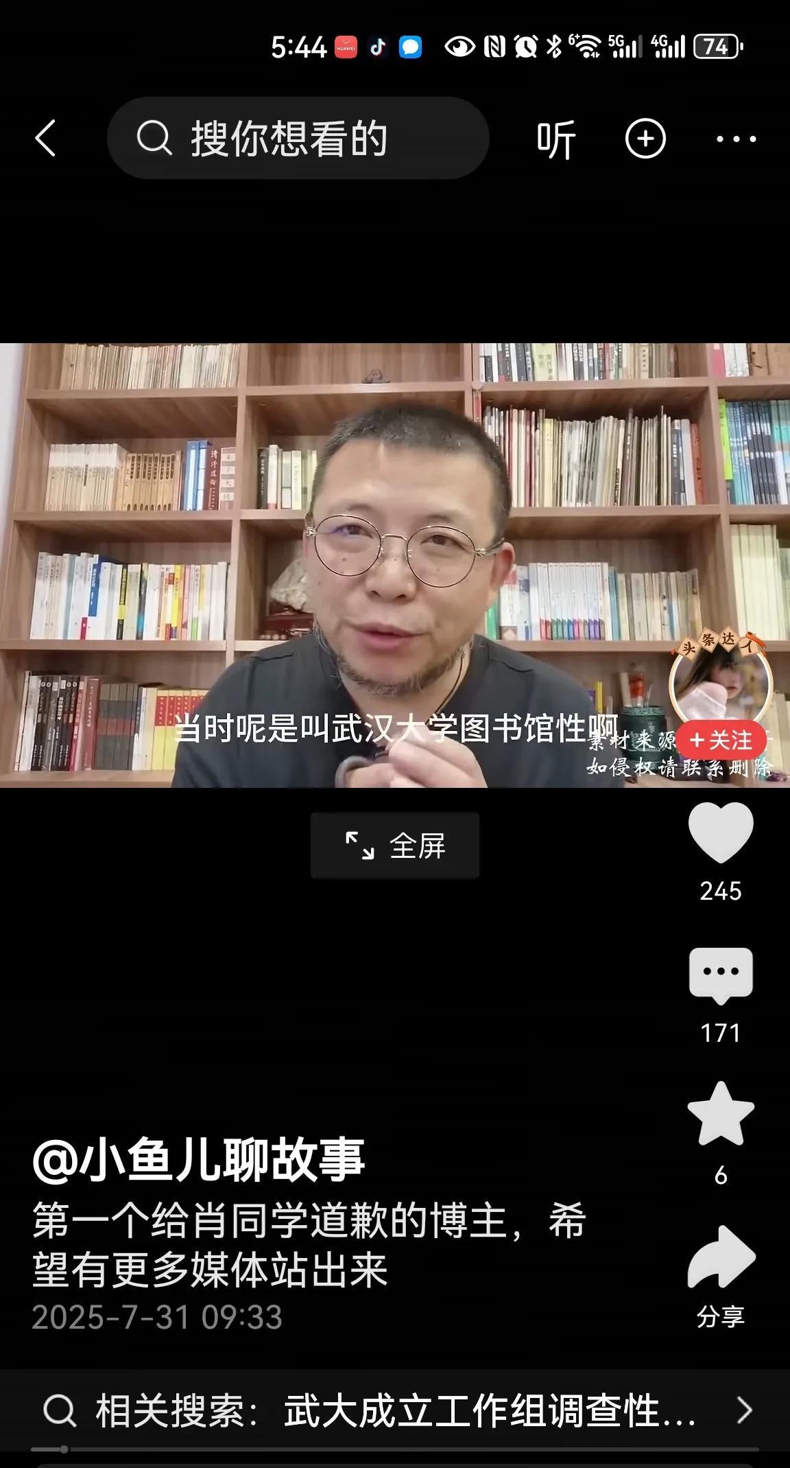 全网首个向武汉图书馆性骚扰事件男主肖同学的道歉来了!一个视频,检讨当年掺合批评肖