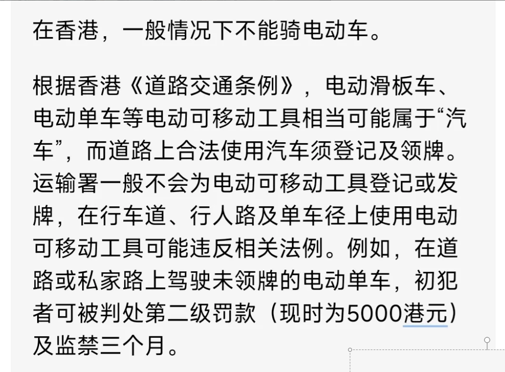 香港警察也是查电动车的,而且不管戴不戴头盔都要查,查到了之后就要罚款5000港元,再加监禁三个月。 因为在香港,电动滑板车,电动单车之类的移动工具可能相当于汽车。如果要合法上路的话,就必须要领取牌照才可以。可问题是人家根本就不可能给这些东西发放电动车牌照,所以只要开骑着车上路,100%就是违规的。 香港警察有时候也会在路上查扣这些电动自行车,所以在香港还是小心一点为好。 香港是可以骑摩托车的,但同样需要考取相应的驾驶执照。 但说实在话,香港那里地少人多,道路狭窄,汽车的普及率还真不如咱们大陆。像香港这种地方,其实最适合的还是电动自行车或者摩托车。 可不知道为什么,他们就不愿意放开电动车的市场,甚至连生产都不让,实在让人难以理解。