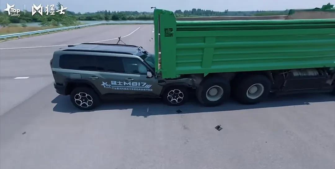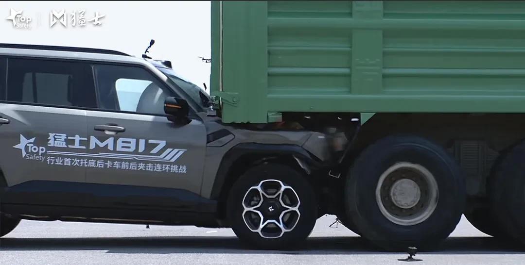 国企撞击测试还是太老实,学学新势力车企,如果猛士M817追尾重卡,把重卡后车轮顶
