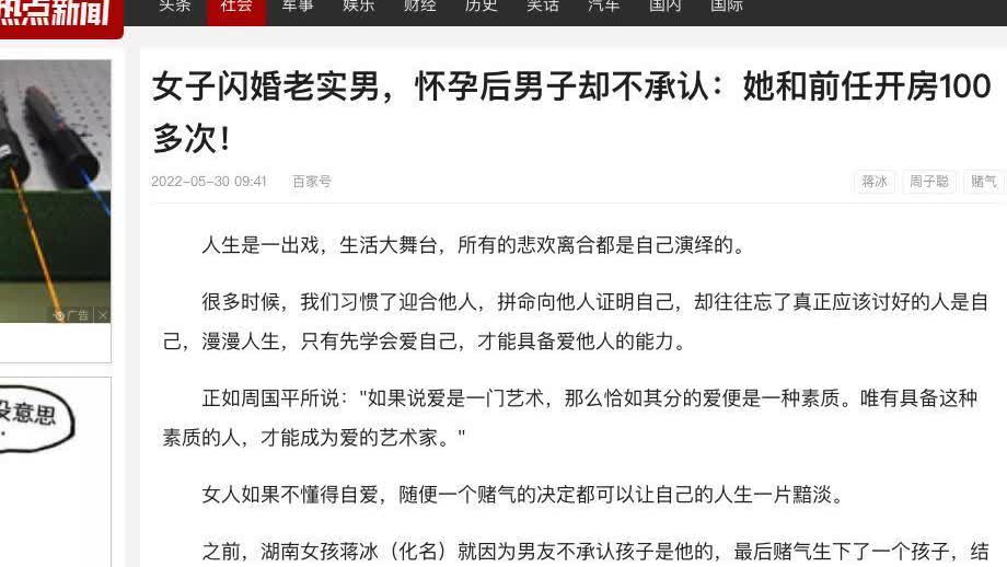 “谁让你随便就开房!”湖南,男子订婚前晚,女友突然告诉他,她怀孕了,男子觉得蹊跷,一调查,发现女友在他之前,相亲了100个男友,开房100次,他怀疑自己是接盘侠,于是,他在订婚宴上,当着亲朋好友,揭穿女友不为人知的真面目。可女友执意把孩子生下来做亲子鉴定,并跟男子索要100万赔偿,结局惊呆众人。 湖南有个哥们儿叫周子聪,跟姑娘蒋冰恋爱没多久,俩人就打算在2022年5月把婚给订了。结果订婚头天晚上,蒋冰蹦出来一句:“我有了。”周子聪一听,心里直犯嘀咕,俩人处的时间不长,蒋冰之前还老拿“守身如玉”那套说辞拒绝亲近。于是他偷摸一查,好家伙,蒋冰相亲历史丰富,开房记录都上百条了,感觉自己这是要当“接盘大侠”啊。于是订婚宴上,周子聪直接开腔,把蒋冰的“私生活”翻了个底朝天,说她骗感情。蒋冰呢,一口咬定孩子就是周子聪的,还说要亲子鉴定,顺便索赔100万。 订婚宴愣是变成了“批斗大会”。周子聪这人挺实在,一开始对蒋冰那是无条件信任,结果这回动了真格。他一查蒋冰,发现她酒店记录多得跟米似的,跟不少男的都有过亲密接触。这下他火了,直接在婚礼现场把蒋冰的“光辉事迹”给抖搂出来了,婚礼瞬间变成了闹剧,蒋冰也被推上了风口浪尖。她哭着解释说那都是陪前男友跑业务闹的,开房也是为了工作。但周子聪哪听得进去,认定蒋冰就是个不规矩的主儿,孩子也不是他的。蒋冰一看这情况,干脆自己把孩子生下来,用事实说话。 亲子鉴定结果一出来,孩子还真是周子聪的。这下他傻眼了,抚养责任逃不掉了。蒋冰呢,带着孩子就走了,复合?没门儿!这误会和偏见,最后弄得俩人彻底掰了,没法挽回。等真相大白的时候,周子聪才后悔,自己不光是冤枉了蒋冰,还把一个真心爱他的人给弄丢了。一场误会,一段婚姻就这么完了,一个家也散了,这教训,可真够喝一壶的。