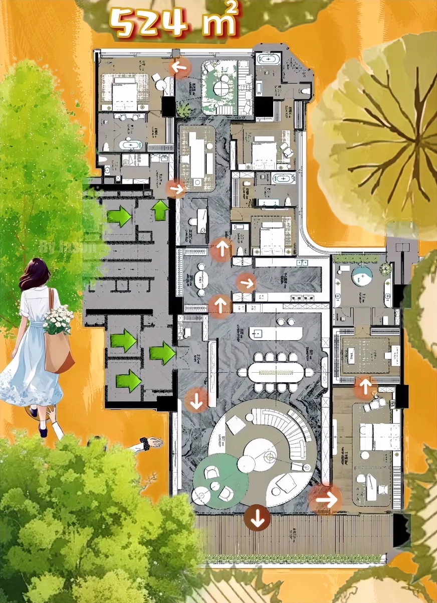 真正的高手,大脸盘自生光华,顶级的大平层,繁如五脏六腑户型,动线畅通运转,外在没啥变化! 524㎡靠四个精髓!有腔调大宅,还,又拽又野的! 你可以玩命吹捧,它! 你说反其道布局,也对,四个卧室居然面阳、通风不愁,阳光不缺,这是得。舍得让小公区,做配角,书房、茶室、鞋帽间、早餐台,都是有风无光,在一条40米横厅上工作! 二精糙,做减法,40米横厅,大大小小九个空间,布局上一镜到底,简之又简,最南头15米花园,有诗中有江南的容颜,动线一切从简,不弯弯绕! 横厅视野不损失,得道成功!第三个精髓,在包容,屋里藏空间。打造四个标准的主卧,三件套是套路,四件套是六星高配,尤其是主卧,门的位置差二分,完全不影响私密空间,书房这个加强排,书香门第显力量! 沾三分之一花园的,光味道! 第四个西北角的外置式,保姆房,角落里的和谐共生,面积不大,功能强大的小平台,一亩地的烟火气,从这儿活起来!顺应大平层的自然环境! 还有东风吹,却有一股回锅肉的味道!