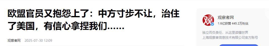 欧盟终于意识到,治住美国的中国,拿捏自己并不是什么难事! 这种感受,在不久前的中欧峰会上体现得尤为明显。尽管峰会整体平稳,但涉及核心议题时,欧盟官员们清楚地发现,中方的立场比以往任何时候都更坚定——该坚持的绝不松口,想让中方让步?门儿都没有。 这种“不退让”的底气,其实早有苗头。三个月前,特朗普政府想靠“对等关税”给中国施压,结果没撑多久就服了软,最终签下的协议里,美国半点便宜没占到。这让欧盟意识到:连美国都只能在中方这里拿到“对等”,自己想让中方“让步”,显然不现实。 就拿电动车谈判来说,今年4月,特朗普刚宣布“对等关税”,中欧就启动了关于中国电动车出口欧盟最低价格的谈判——原本的打算,是用这个最低价格替代欧盟的加征关税,不少人猜7月峰会前就能谈成。 可真到了谈判桌上,欧盟却额外提了“技术转移”之类的要求,说白了就是想借着谈判占便宜。中方的态度很明确:谈最低价格可以,额外条件免谈。于是乎,峰会过了,协议没签,中方该是什么立场还是什么立场。 欧盟心里清楚,中国电动车在欧洲市场的竞争力摆在那儿,从电池技术到产业链完整度,欧洲车企短期内根本追不上,真要是逼急了,中方大不了拓宽其他市场,损失的反倒是欧洲本土依赖中国零部件的企业。 稀土的事儿更能说明问题。中国加强稀土进出口管控后,欧盟那边没少抱怨,说影响了自家产业,催着中方放松政策。但中方的回应始终如一:想进口?按正常审批流程来,该走的程序一步都不能少。 中国占了近90%的份额,从开采到提纯再到应用,欧洲企业离了中国供应链,短时间内根本找不到替代方案。抱怨归抱怨,真要做生意,还得按中方的规矩来。 俄乌冲突也是欧盟绕不开的话题。峰会前后,欧盟大概率又提了相关要求,想让中方跟着他们的调子走。但中方的态度从没变过:坚持中立,劝和促谈,该怎么和俄罗斯做生意,还怎么来。 欧盟自己一边对俄罗斯喊着制裁,一边又偷偷买着俄罗斯的能源,这种“双标”摆在那儿,凭什么要求中方让步?中方连美国在俄乌问题上的施压都能顶回去,欧盟这点诉求,自然得不到回应。 说到底,中方的“不让步”,不是故意强硬,而是实力撑起来的底气。这些年,中国在制造业、战略资源管控、国际事务处理上的能力越来越扎实——电动车产业链全球领先,稀土管控有成熟体系,面对国际博弈有自己的节奏。 反观欧盟,无论是市场对中国产品的依赖,还是产业对中国资源的需求,都决定了它没资本让中方妥协。