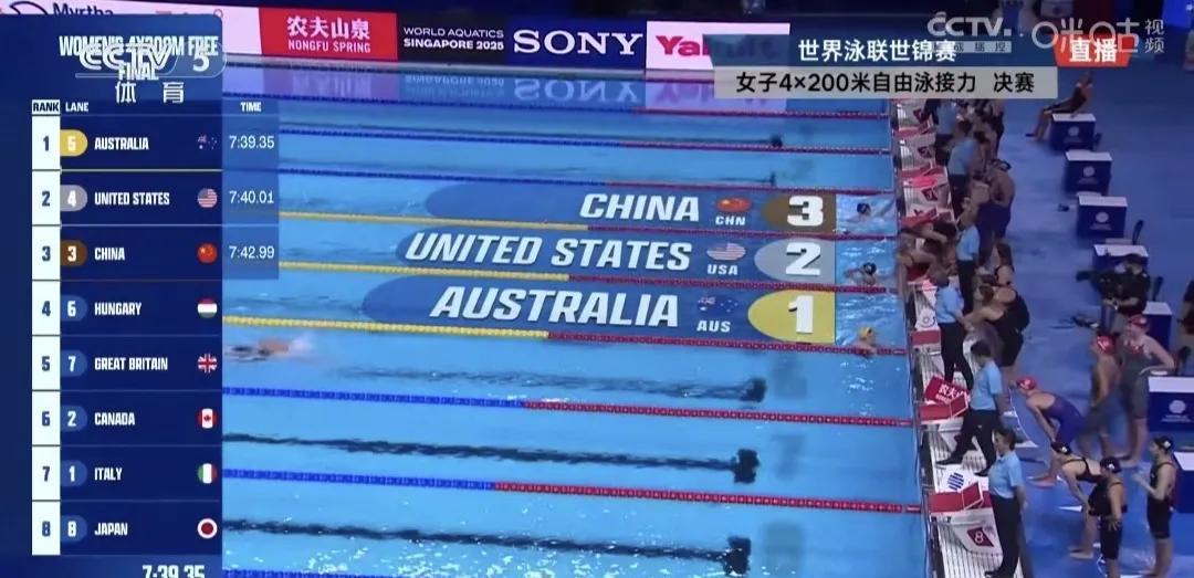预赛第三,道次第三,决赛第三!中国女队摘铜 7月31日晚,世锦赛游泳项目最后一场比赛。中国队参加女子4x200米自由泳接力决赛。 预赛,由于子迪、余依婷、吴卿风、杨佩琪组成的中国队,游出7分54秒06的成绩,以第三名的身份晋级决赛。 美国队、澳大利亚队分列预赛第二。晋级决赛的还有匈牙利、加拿大、英国、意大利、日本。 决赛,中国队更换阵容,四棒分别为柳雅欣、杨佩琪、余依婷、李冰洁。中国队第三道出发。 比赛自始至终,中国队一直名列第三。金牌之争,在美国队与澳大利亚队之间进行。美国队领先大半程,被澳大利亚队反超。 最终,中国队收获第三名。 此前,中国选手万乐天游出27秒30,摘取女子50米仰泳铜牌。