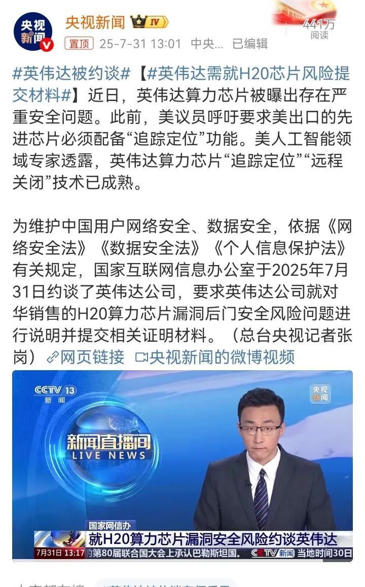 黄仁勋:首先,我是中国人,后来我成了美籍华人! 黄某人突然开始和我们套近乎,打感情牌了,为什么? 英伟达日子不好过! 7月31日,英伟达因H20芯片的安全问题被约谈! 据美国相关专家透露,英伟达算力芯片“追踪定位”,“远程关闭”技术已成熟! 这后门开的,比老特的嘴都大! 能“远程关闭”,就能“远程开启”,这哪个企业敢用?