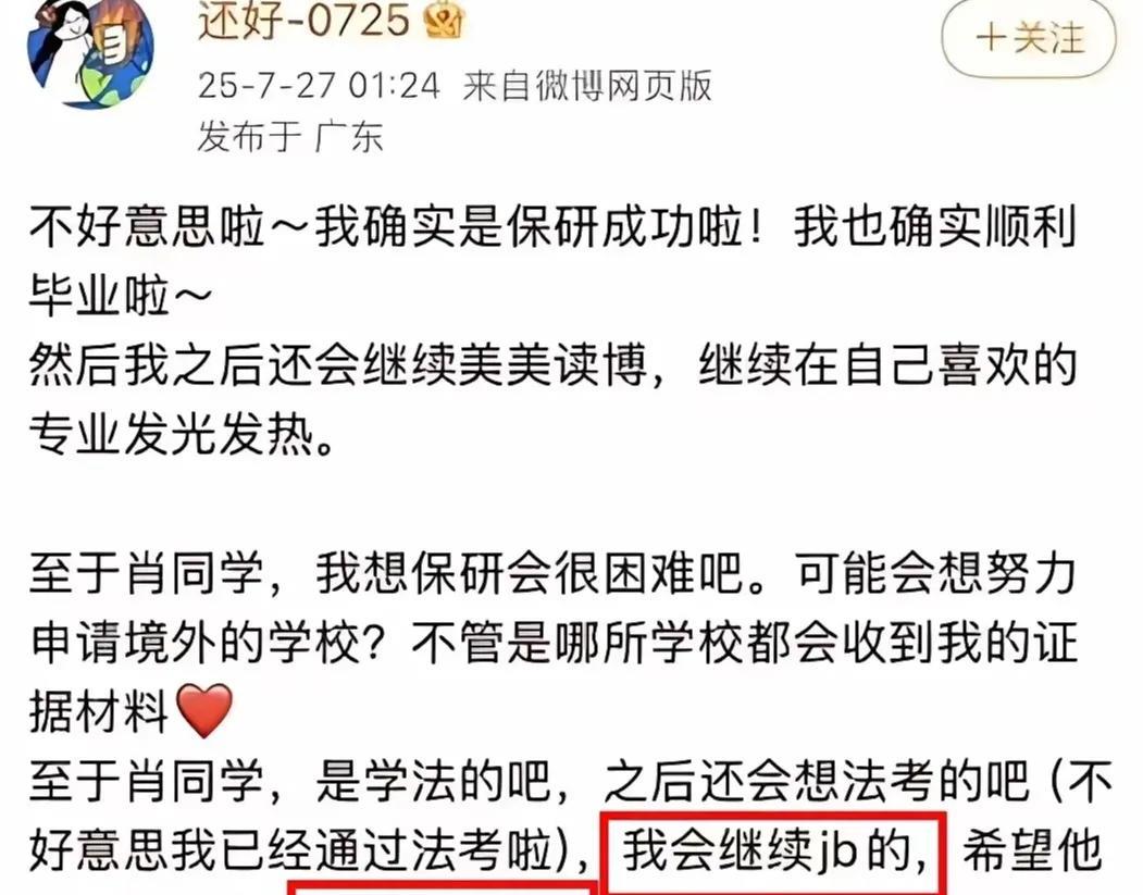 这个武汉大学杨景媛太厉害,诬告肖某后,还能在微博发文炫耀。 一审驳回,意味着肖某