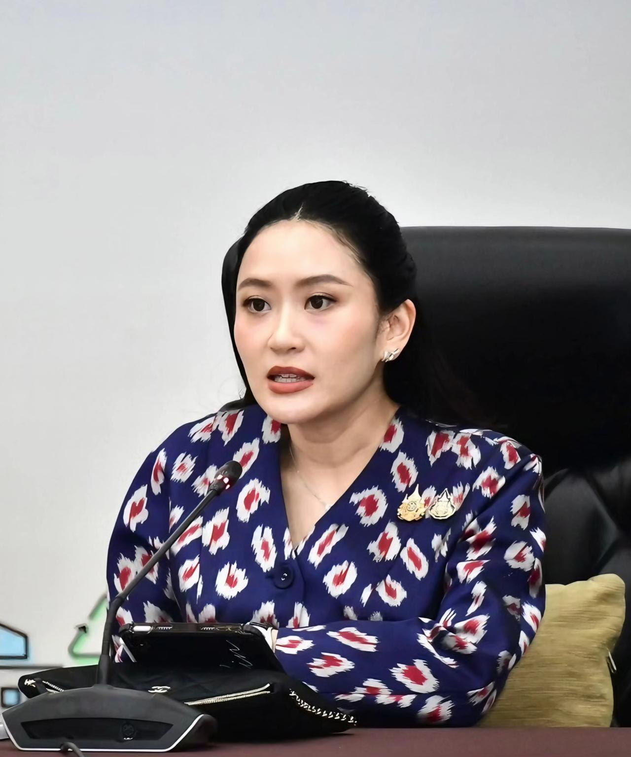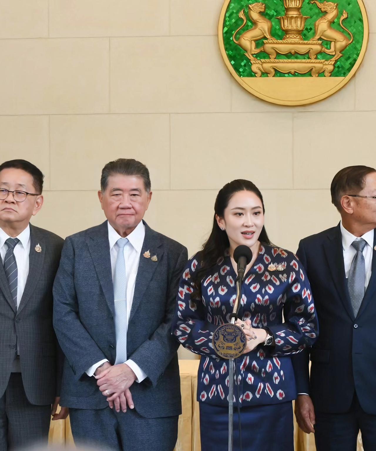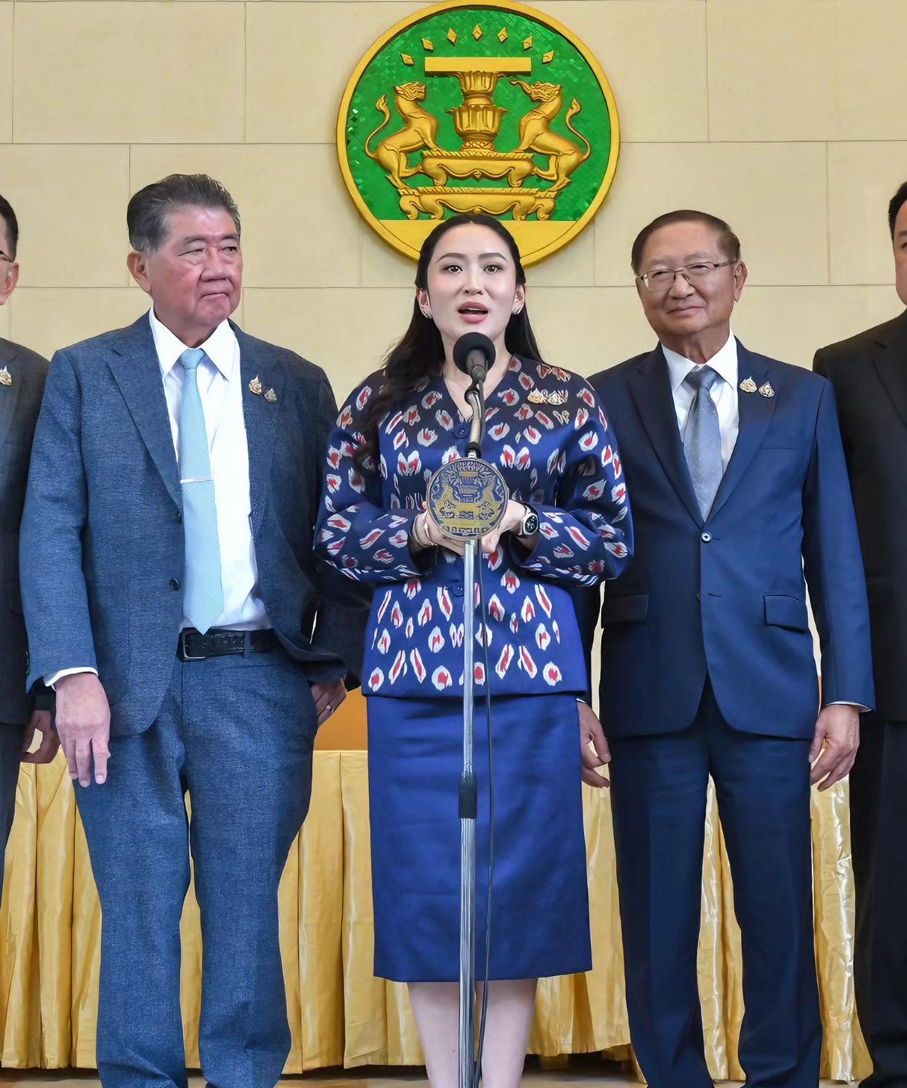 佩通坦优雅知性,一袭蓝色职业套裙好惊艳 6月18日,泰国总理佩通坦就泰柬局势接受