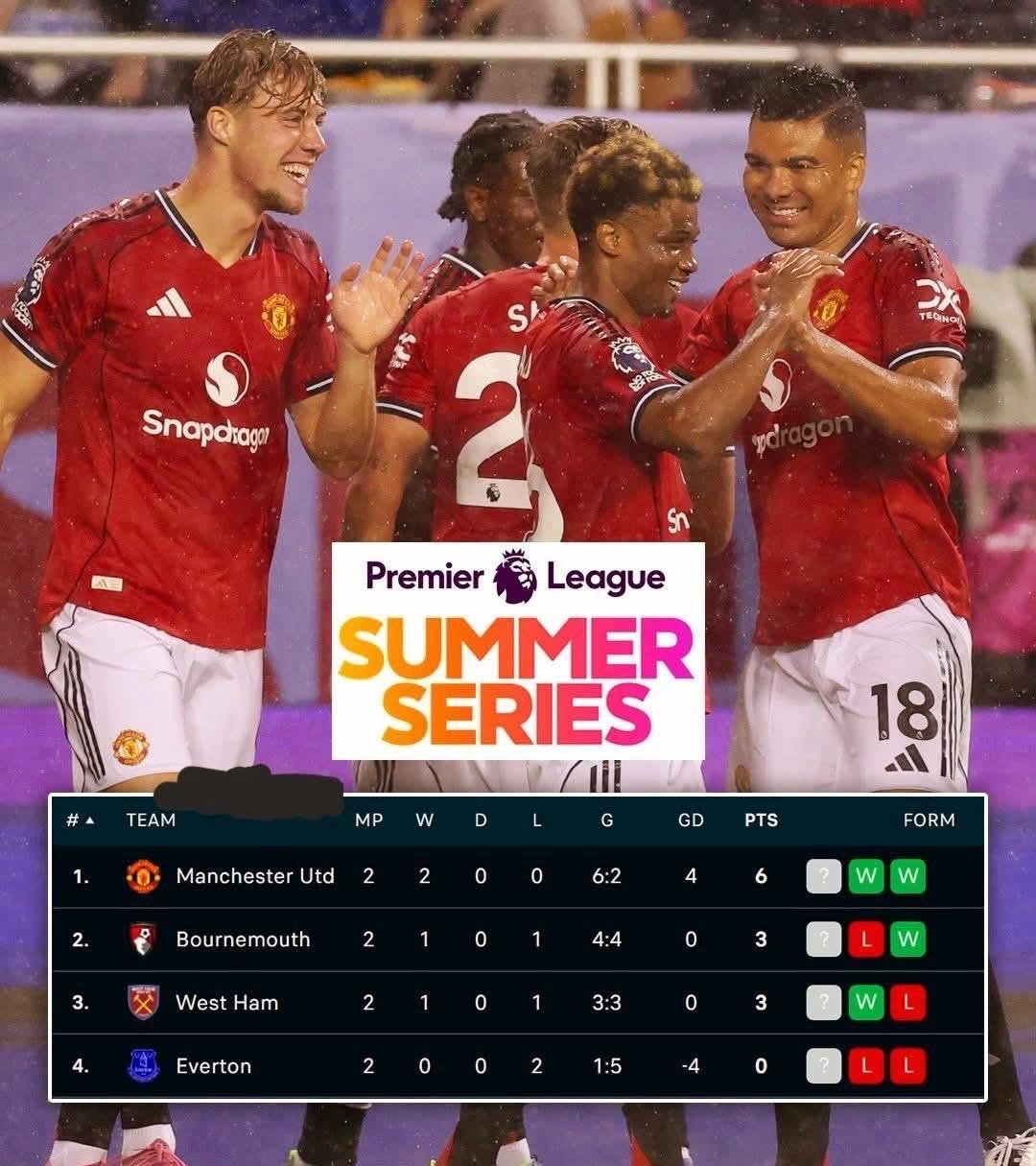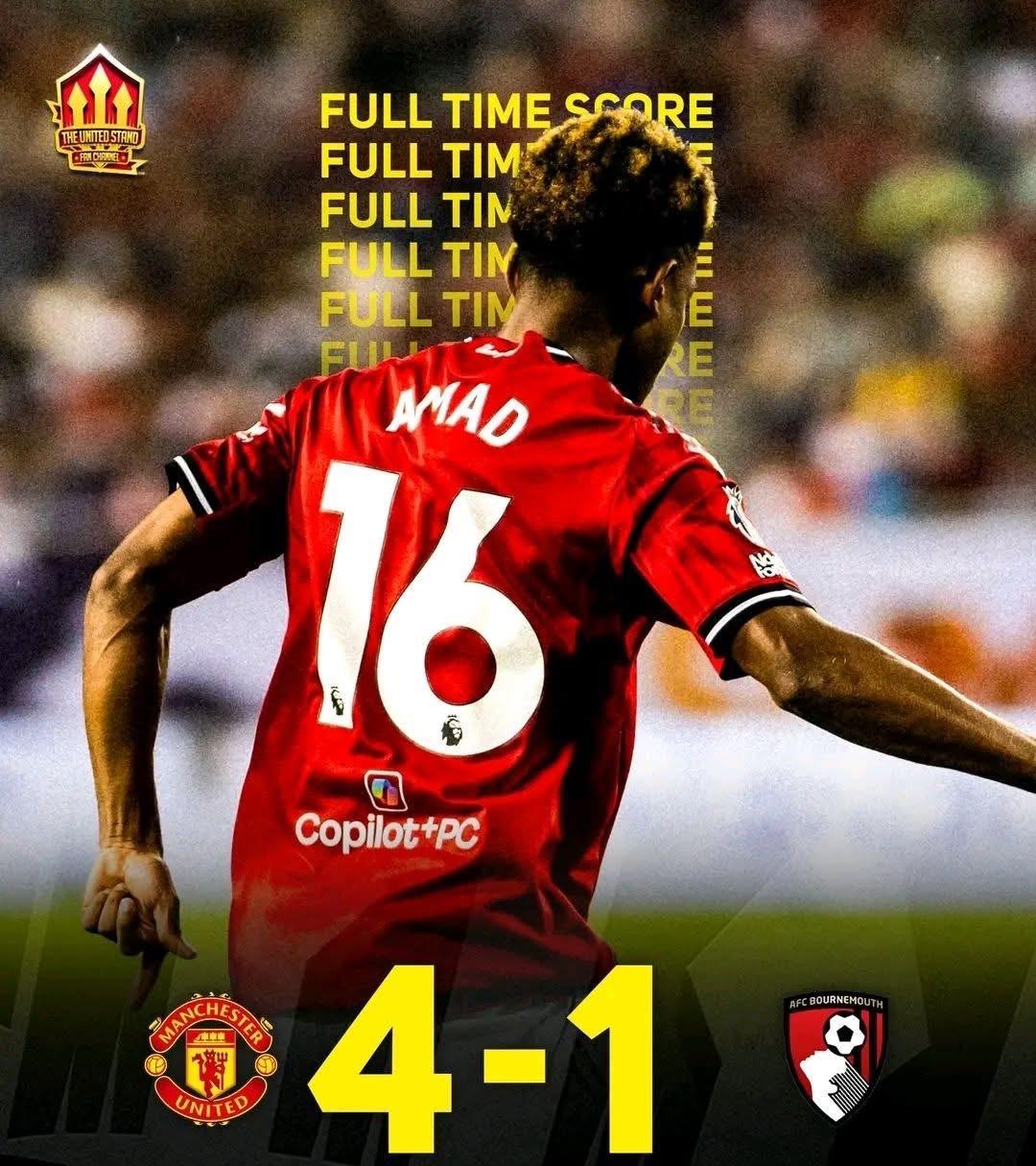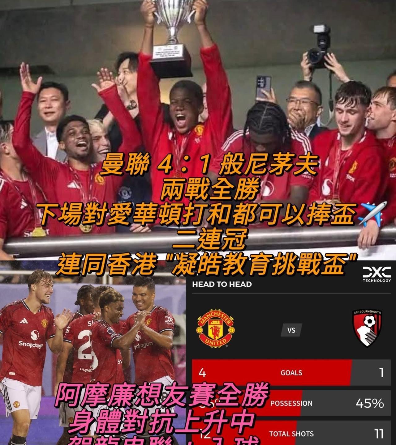 曼联回归?准备在2025/2026赛季夺冠!? 虽然只是友谊赛,但过去一个赛季,曼联几乎已经要忘记赢球的感觉了,所以能赢球,尽管只是友谊赛,那也是很棒的感觉。 红魔全场打进五个进球,最终以4比1大胜伯恩茅斯。 要知道,上赛季曼联可是曾经在主场0比3惨败给小樱桃的,现在可以复仇,信心上是非常关键的。 据了解,主教练阿莫林为曼联定下了要赢得英超冠军的目标。 或许很多球迷会嗤之以鼻,但曼联始终是曼联,红魔的存在,就是为了争夺冠军,不是吗? 霍伊伦德 8' 多尔古 25' 阿马德 53' 威廉姆斯 72' 德莱赫特 88' (OG)