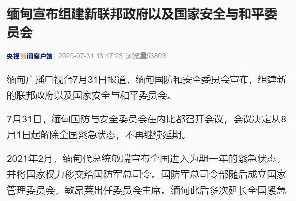 柬泰停火后,又一中国邻国突生巨变;领导人就此下台,出口中国的稀土要转卖美国? 缅甸国家管理委员会7月31日宣布,自8月1日起终止全国紧急状态。这场持续53个月的特别状态始于2021年2月军方接管政权,期间经历了五次延期。值得关注的是,此次解除紧急状态恰逢东盟轮值主席国更迭前夕,分析人士认为这可能是缅甸重返区域合作的重要信号。 其中最受瞩目的是缅甸政坛迎来重大人事调整:原军政府领导人敏昂莱卸任总理职务,转任新成立的"国家安全与和平委员会"主席。新任总理由敏昂莱的前顾问吴纽梭接任。值得注意的是,官方声明未明确提及现行最高权力机构"国家管理委员会"的存废问题,这为后续政治走向留下悬念。 此次缅甸权力架构调整的深层动机仍不明晰,存在多种解读空间:既可能是敏昂莱试图通过制度性布局来维系其政治影响力,亦不能排除军方为推动民族和解进程而作出的实质性妥协。官方将此次调整阐释为在“局势可控化”大背景下的治理模式革新,这似乎暗示着缅甸或正着手构建一种“文官主政、军方保驾护航”的新型权力格局。有分析人士认为,这一转变或许映射出军政府在国际制裁的重压之下,寻求政治破局的战略意图。 缅甸此次政治重组恰逢两大关键地缘事件: 一是东盟在中美协调下成功促成柬泰停火,中国展现的调停能力可能促使敏昂莱通过政府改组向中方释放缓和信号; 二是美国对缅甸稀土资源的战略争夺——特朗普政府以40%关税为筹码施压,同时试图绕过军政府与克钦独立军接触,旨在切断缅甸稀土对华供应链。分析认为,敏昂莱的决策既是对中国区域影响力的回应,也是在美国经济胁迫下的折中选择
