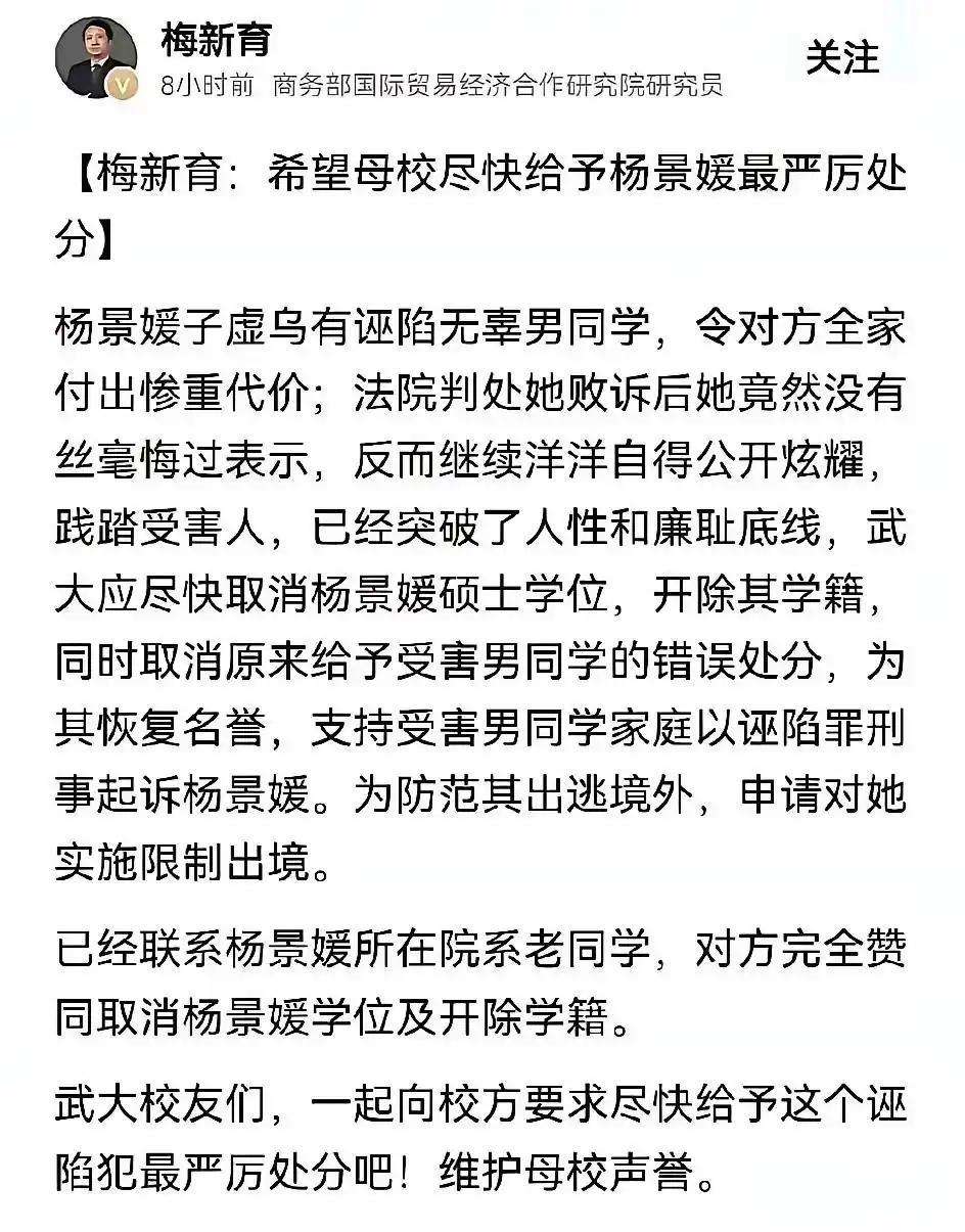 杨景媛是什么人? 杨景媛是武汉大学经济学世界经济专业2017级学生,因2023年7月在图书馆拍摄同学肖某某并指控其性骚扰而引发广泛关注。该事件经法院审理后于2025年7月宣判,认定"无法认定肖某对杨景媛实施性骚扰"。 杨景媛被指在微博发布大量直白露骨的性暗示内容,有分析认为其言行呈现"性压抑"特征。败诉后仍持续在社交媒体嘲讽涉事男生,被批评"毫无悔改之心"。 杨景媛作为武大理论经济学学术型硕士,唯一公开论文《中印生育行为影响家庭暴力的经济学分析》被指选题与专业方向不符。检索显示未发表过符合学术型硕士毕业要求的期刊论文,引发对其学位合规性的质疑。 导致武汉大学陷入"学术乱象"的舆论风波。该案也成为近年来高校诬告事件的典型案例。