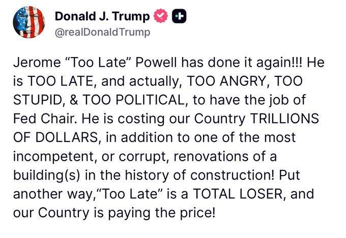 特朗普再次开骂美联储主席鲍威尔 2025年7月31日美联储宣布维持联邦基金利率在4.25%-4.50%区间不变,这是连续第五次按兵不动。特朗普随即在"真实社交"平台发文,用"太迟先生"称呼鲍威尔,指责其决策迟缓导致美国损失数万亿美元。 特朗普希望降息300基点以减轻37万亿美元国债利息压力,而鲍威尔坚持通胀未达标(核心PCE2.5%)且需观察中东局势影响。 特朗普政府以"作伪证"为由要求国会调查鲍威尔,但美联储援引《联邦储备法》强调主席任期受法律保护。