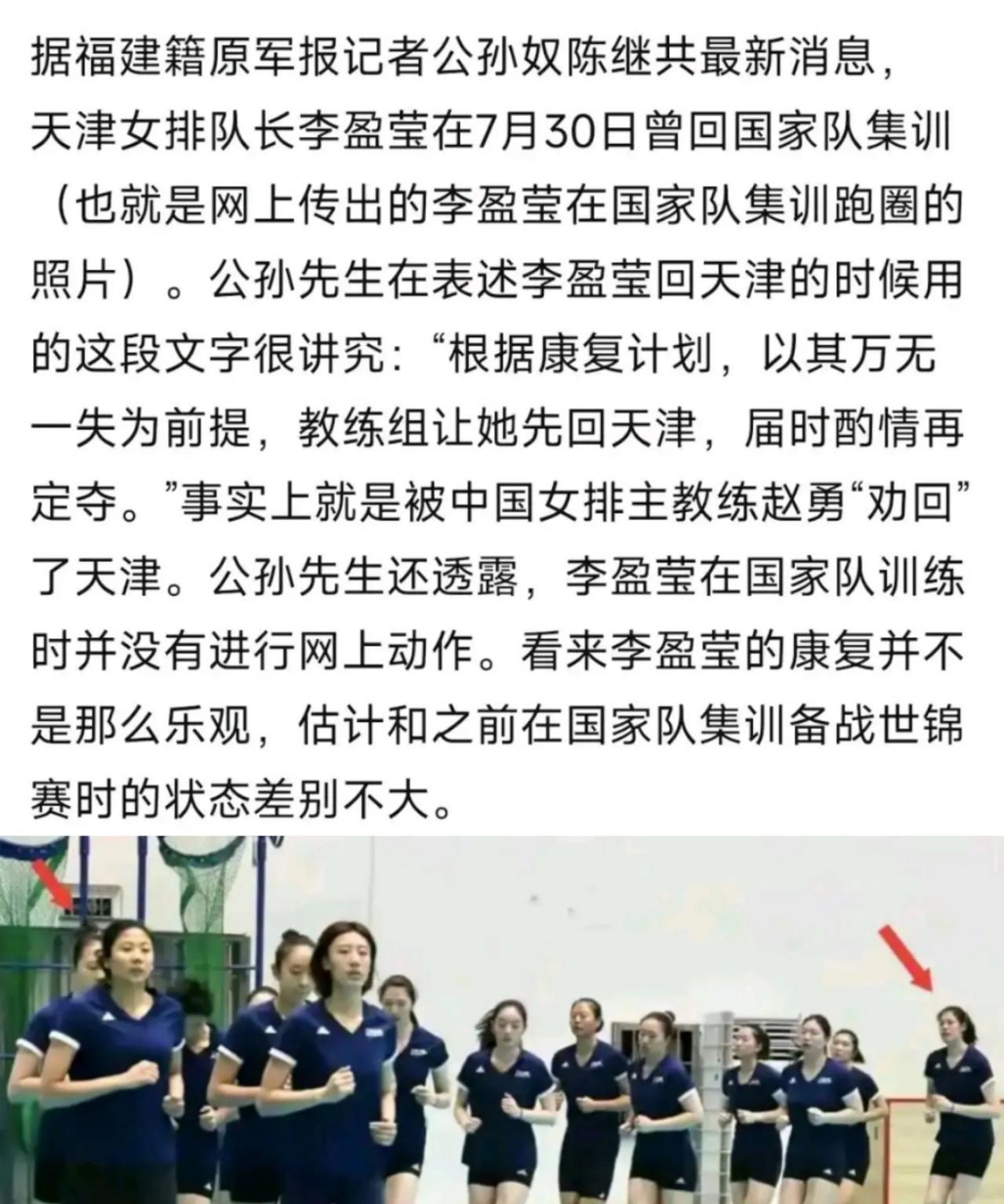 李盈莹被赵勇退货,尽是折腾伤情没恢复为什要随队去香港端茶送水!现在又跑去福建漳州集训一天露过脸之后又被劝回天津养伤。这是谁的问题,是排管还是排协,或者是和天津地方体育领导互相伤害没有沟通好。世联赛九胜三败看来赵勇团队很有底气,只要在世锦赛进八强便达到上面领导的指标。现在的李跳不起,跑不动难道会心甘情愿上场发个球做个啦啦队员。赢球进八强还好万一输了说不定还要背锅,估计天津领导教练劝李不要参加世锦赛。当然主教练赵勇为了证明自己的眼光,打造自己的铁杆班底更不想李参赛。唯独一些莹粉一厢情愿认为李回归就能进四强!其实伤好以后回到国家队不拖后腿还能保持原来八成实力已是幸运。
