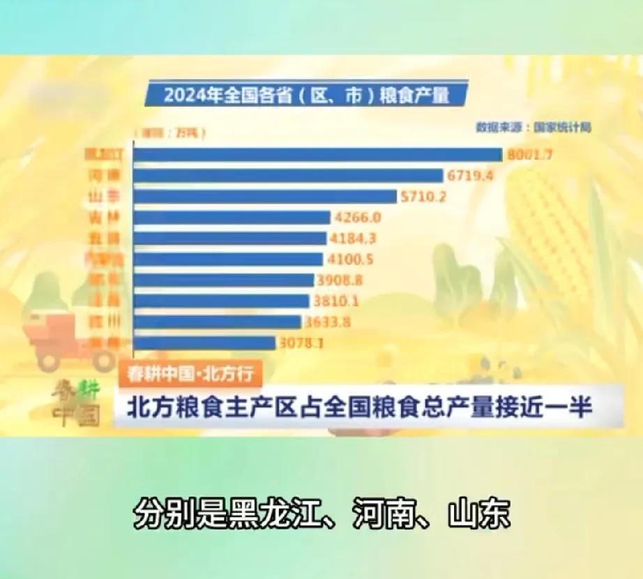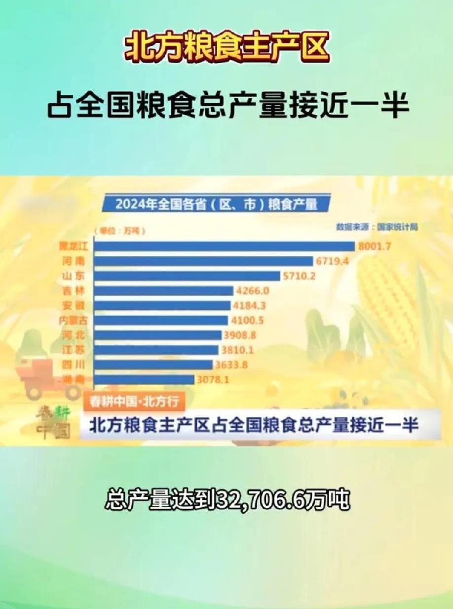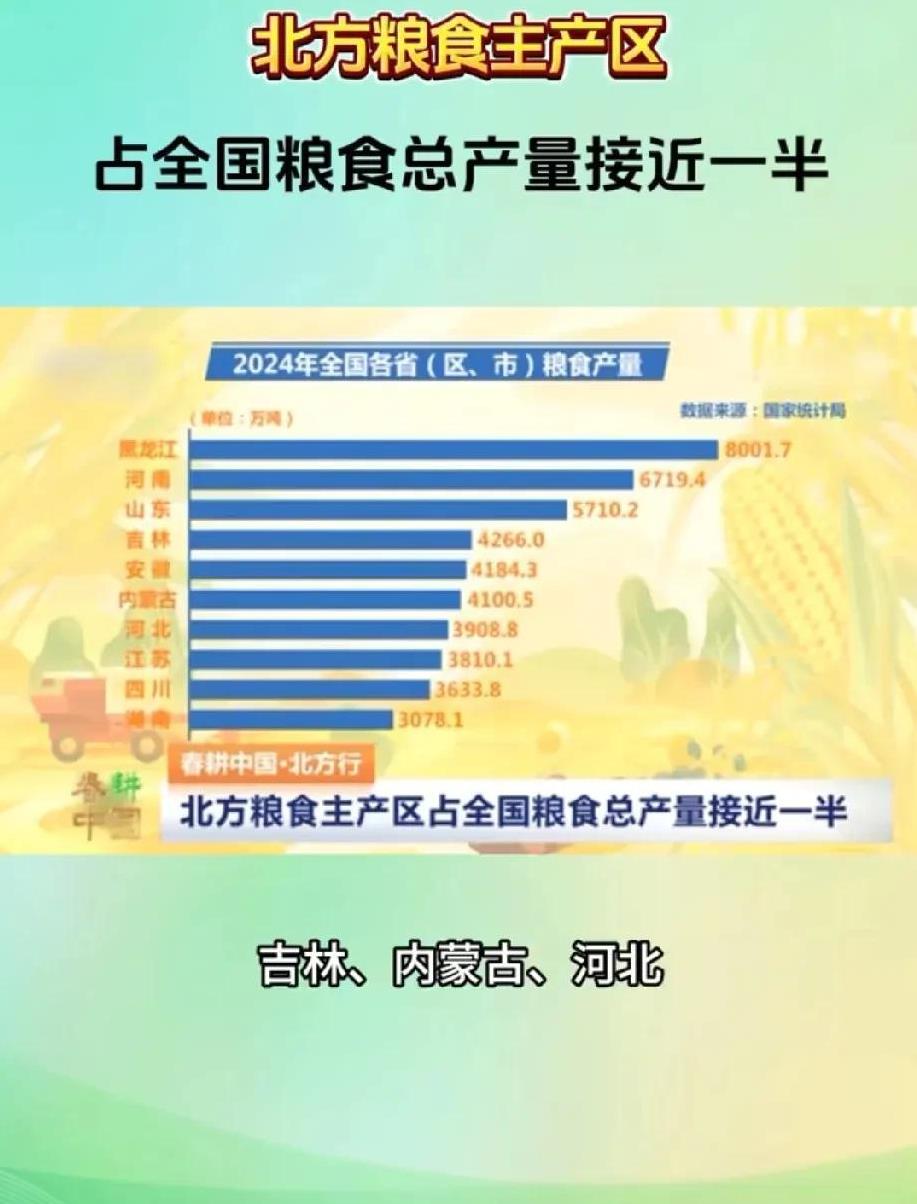 #头号创作者激励计划#中国十大产粮大省,黑龙江位居榜首 农业农村部中国农技推广报道,2024年中国粮食产量70650万吨,10大产粮大省里,6个位于北方,4个位于南方,黑龙江省位居榜首。 10大产量大省分别是:黑龙江,河南,山东,吉林,安徽,内蒙古,河北,江苏,四川,湖南。 北方6省是:黑龙江,河南,山东,吉林,内蒙古,河北 南方4省是:安徽,江苏,四川,湖南。 南方4省里,安徽和江苏的产量主产区位于淮河流域以北,按照中国南方分界线划分,皖北,苏北一定意义上来说,也是北方。#粮食产量# #粮食产量排行榜# #粮食对比# #粮食产量对比# #东北粮食产量# #黑龙江粮食产量# #山东粮食产量#