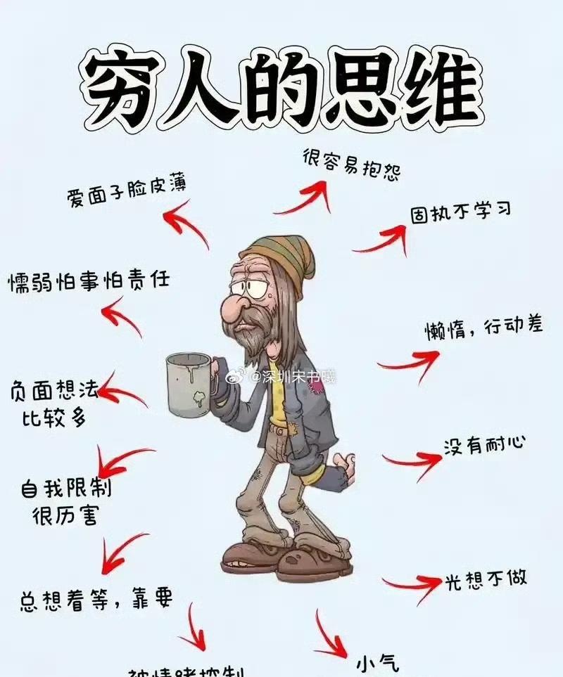 穷人的思维: 什么是穷人思维,刘震云这段话扒皮见骨,他说:“穷人赚不到大钱,抱怨父母无能;穷人娶不到媳妇,抱怨女人拜金;穷人没钱养老,抱怨子女不孝; 所有的光棍,都不是因为不够帅,而是因为不会骗;所有的穷人,都不是因为没有钱,而是因为没有胆;所有的弱者,都不是因为不够拼,而是因为不够狠; 找不到好工作,不是因为能力低,而是因为价值小;当不了领导,不是因为资历浅,而是因为送礼少;处不好关系,不是因为脾气差,而是因为人太抠。” 《认知觉醒》里说:“人类的天性,总是在欲望上急于求成,却在行动上,避难趋易。” 毁掉一个人的,从来不是懒惰,而是安逸。穷人宁愿挨饿,也不愿走出舒适区;农民,宁愿种一辈子地,也不愿意动脑子赚钱 。 人群中每一个耀眼的人,都是踩着刀尖过来的,贫穷不是命运使然,而是认知局限。富人赚到的每一块钱,都是实力的变现,因为,人的收入,只能增长到,其能力增长的程度。 穷人和富人,两者最大的差距,从来不是金钱,而是思维逻辑。金钱只会流向最匹配它的人,苦难只会流向最能吃苦的人。 穷人认为,思维上面的差别,导致了资本的差别;其实真相是,资本的差别,导致了思维的差别。思维的差别,又造就资本的差别。 富人擅长投资,每一次投资,都有长远目标。穷人更擅长消费,每一次消费,都是为了满足眼前的欲望。 世界上最可怕的,不是没钱,而是你来晚了。好东西要靠抢,慢一点,机会就被抢光了,连喝汤的机会都没有。 富人思维,说穿了就是舍得拿钱去赚钱,舍不了孩子套不着狼。拿钱不当钱,才能赚到钱,投资输得起,反而更容易来钱。 比知道方法,更重要的是知道原理。大多数人之所以赚不到钱,并不是能力问题,而是观念问题,关于金钱,脑子里负面信息太多。 穷人思维认为,金钱是万恶之源,有钱能使鬼推磨,男人有钱就变坏,从小接受错误的金钱观,要么赚不到钱,要么赚到钱也留不住。 富人都爱以大博小,而穷人都爱以小博大。穷人最难看清的,不是别人,而是自己。总是用自己的业余,去挑战别人的职业。 富人越富、穷人越穷,穷人奔波于温饱,富人执着于效率。伟大的人,不是生下来就伟大,而是在成长过程中,不断显示其伟大的。 如果你想成为富人,一定要选择提升自己效率的行业,不管你处在什么位置,你能创造多少财富,你才会拥有多少收入。 只有偏执狂才能成功,只有坚持的人才能致富,富人最厉害的能力,不是自身的专业能力,而是发掘比自己更优秀的人,为己所用。 穷人喜欢存钱,富人喜欢存资产,穷人认为有多少钱,就有多少资产。富人认为,不需要做任何事情,就能给我带来钱的才叫资产。 坚信天道酬勤的,都成了穷人。相信思考致富的,都成了富人。先有富人,再有富人思维。穷人钱多了,会把钱存起来;富人钱多了,会让钱流动起来; 富人究竟是怎么富起来的?富人的存在,是时代的选择,是历史造就的。他们藏匿于资本之中,他们是权力衍生出来的怪胎。 富人不是有钱人,不是高薪雇员,不是老板和商人,也不是富二代,而是企业家。金钱引发战争,金钱导致贫穷。 权力需要资本来加持,而资本需要权力来庇护。他们互相合作,发挥着底层建筑和中流砥柱的巨大作用。 资本盘踞着资源,并利用资源,成为权力的爪牙。资本创造着工作岗位,将更多的人聚集在一起,让更多人能够发挥价值。 富人变富,最大的机会就是“危机”,危机让穷富鸿沟彻底撕裂,当经济危机发生时,沃尔玛和华尔街同时打折,穷人挤进了沃尔玛,富人奔向了华尔街。 穷人思维,就是在信息时代,还固守着工业时代的思维,在工业时代,还固守着农业时代的思维。视野仅仅局限在如何赚钱,赚钱了如何消费。 刘震云在《一句顶一万句》中说:“富人乐于付费,穷人喜欢免费,富人承担风险,穷人追求安全。富人乐于分享,穷人喜欢独占。富人期待稳健增长,穷人期待一夜暴富。 富人舍钱,穷人舍力;富人不缺钱,穷人不缺力。富人在大方向上做选择,穷人在小事情上机会主义。富人喜欢在富人堆里装穷,而普通人则喜欢在穷人堆里炫富。” 如果你出身底层,讨厌贫穷,想要改变,推荐你读一读刘震云的《一句顶一万句》,这本书是刘震云的扛鼎之作。 书中对财富真相的剖析,扒皮见骨,每一句都充满真知灼见,一句有见识的话,不仅能让人瞬间醒悟,还能让人少走许多弯路。(转自于网络)