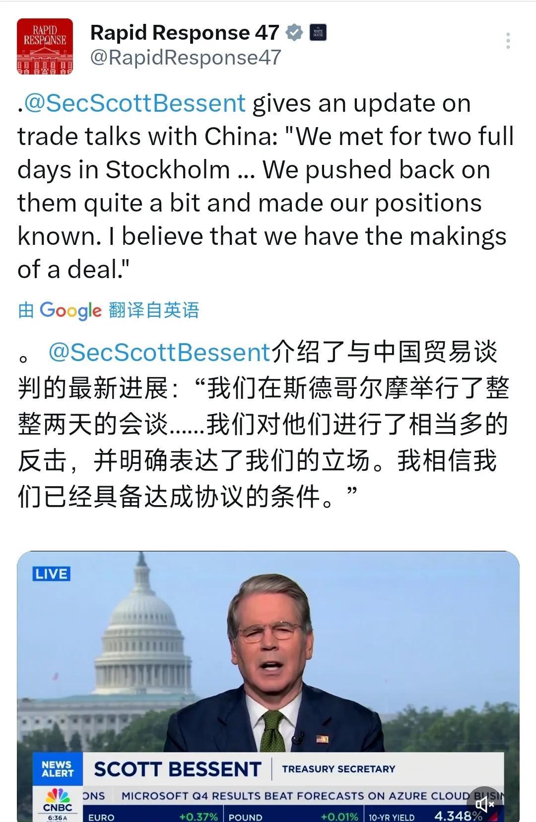 美国财长贝森特昨晚(北京时间7月31日晚)介绍了与中国贸易谈判的最新进展:“我们