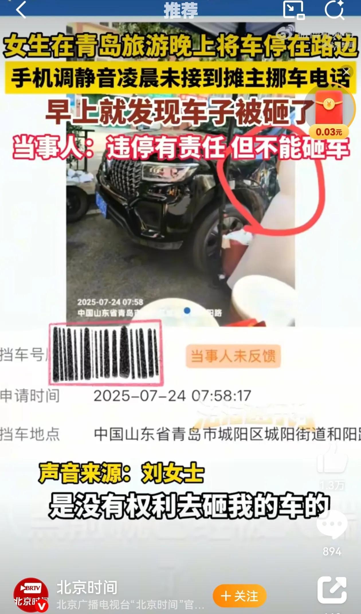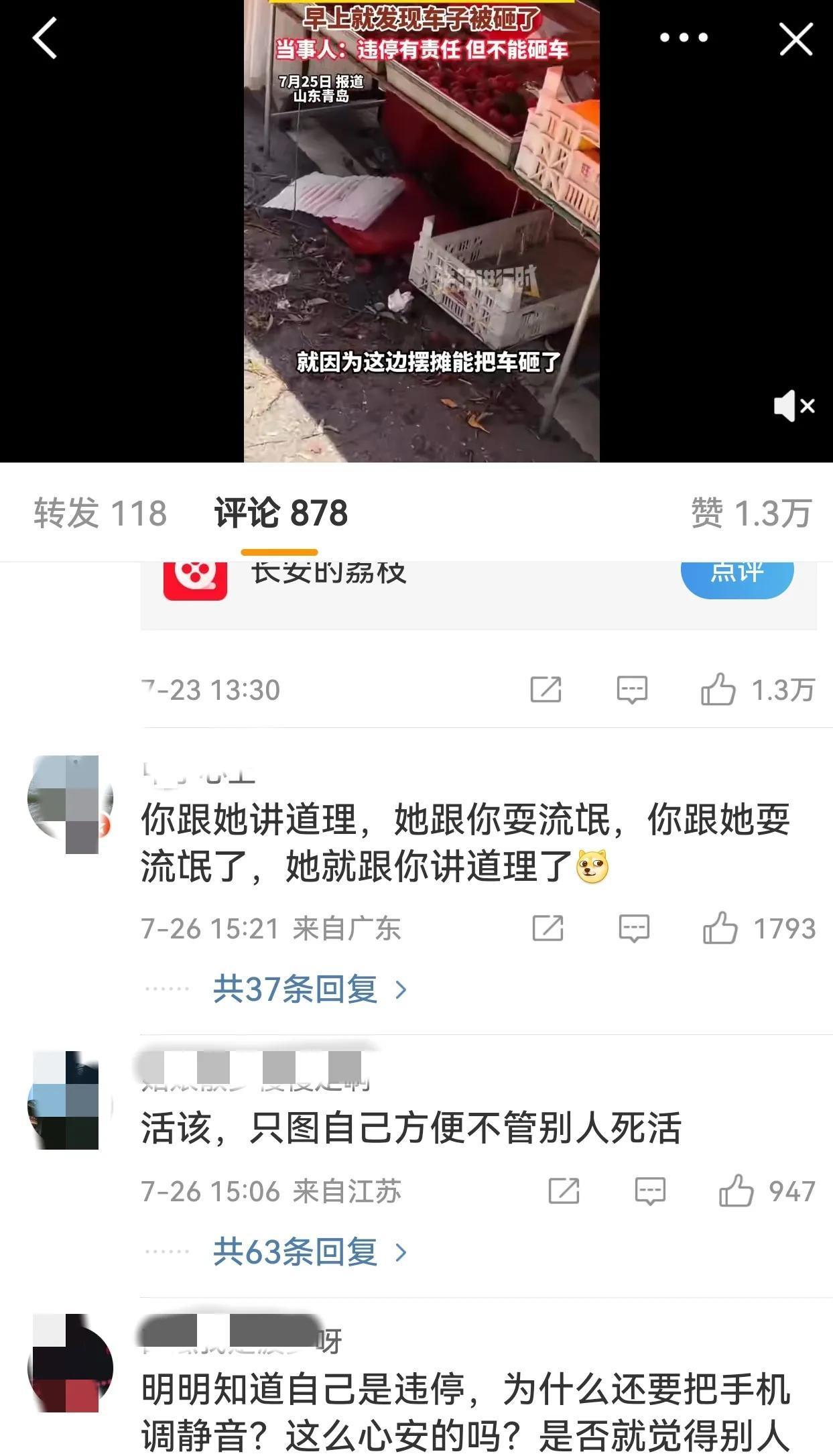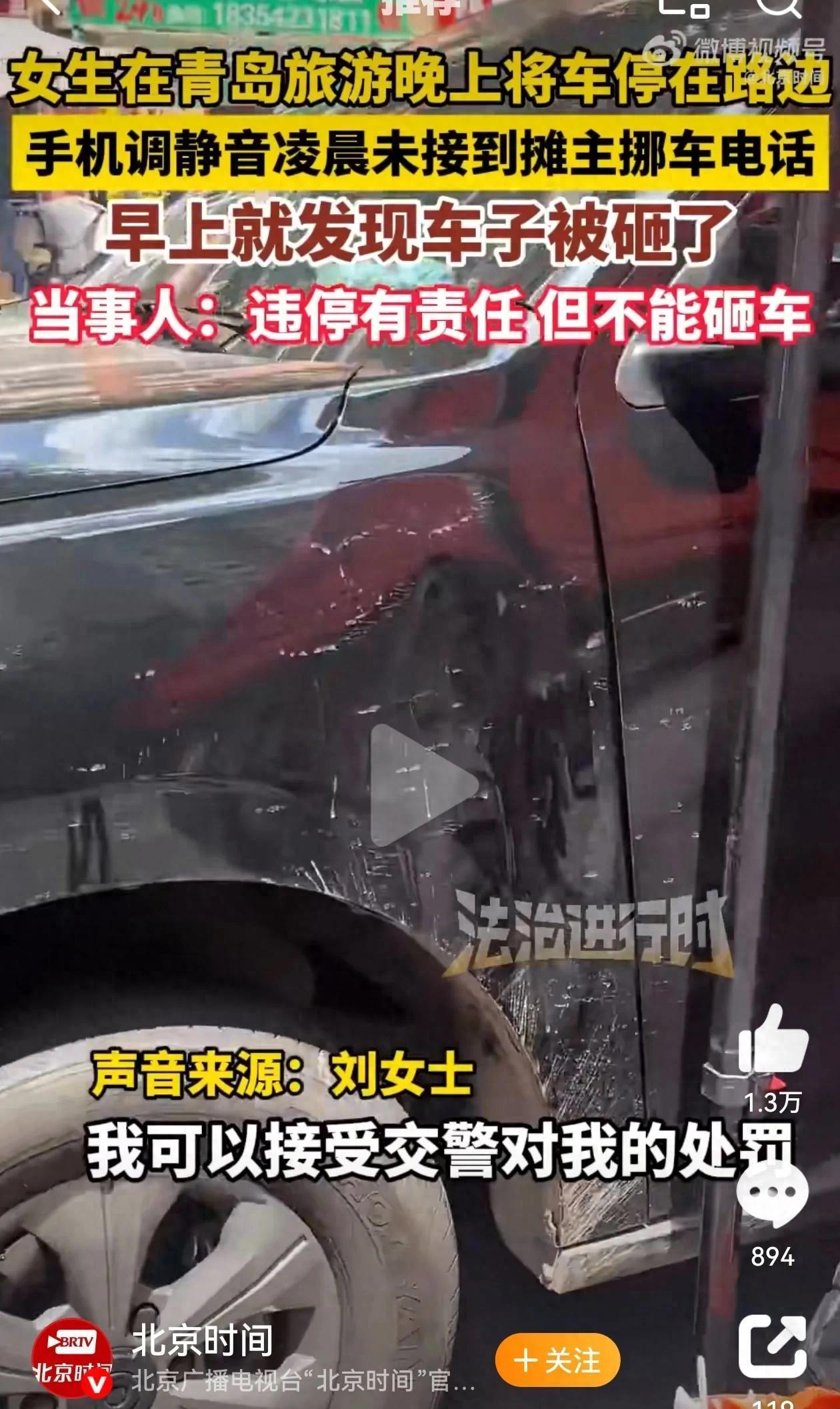“贪小便宜吃大亏!”7月23日,山东,女子来青岛旅游,晚上将车子停放在了路边,不料,该路段是早市经营点,她的车占用了摊主的位置。凌晨4点到6点,摊主一直给女子打电话挪车,但女子手机开了静音没有听到,等女子去开车时就看到车子被人砸了!警方调取监控发现那个位置是盲区,什么都没有拍到。 “我的车停在这儿,就算是有一部分责任,但有事好好说话,怎么能像个强盗一样直接砸车呢?”小刘气愤的对着警察控诉道。 警察站在被砸车辆旁边,一脸无奈的看着小刘:“您先别着急,我们非常理解您的心情,待会儿我们就去调监控,一定追查到底。” 这一幕发生在7月24号上午,小刘原本只是没有想太多也懒得去收费停车场,将车停在了违规地带,便直奔酒店躺在床上大睡特睡,谁知道一觉醒来便到了快中午手机上20多个未接来电,十分刺眼。 当时,小刘还在奇怪自己出来旅个游,也请了假,按理说不会有工作上的事,到底是谁这么无聊在她美滋滋出门旅游的时候,打来电话呢,而且时间显示是从凌晨4点多就开始不断有人在尝试打电话。 这时候的小刘还带着一脸被打扰的不耐烦拨回去了一个电话,没想到对方显示无人接听,她只当这些电话都是谁的恶作剧,也就没有多想,等收拾完毕下楼之后,她立马傻眼了。 楼下自己的爱车,周围人来人往,还有不少搭着遮阳伞的摊位,这时候,小刘也感到有一丝不好意思,因为她意识到了自己的车占到了人家闹市区的位置,但小刘心中的这丝愧疚和尴尬,很快便被愤怒所取代。 等他大步流星的来到自己车旁,瞬间惊呆了,因为自己的车周围不仅分布着一些烂水果,而且车身上还有几处明显的大块凹陷,车身和车窗上,甚至还真有一些水果粘液,一看就是有人故意将水果扔到车上的。 当时小刘一下就炸了,相信谁遇到这样的情况都冷静不下来,于是他对着周围的摊贩大声质问:“这到底是谁干的?谁这么缺德?我一定要报警抓他!” 然而,摊贩只是冷漠的抬眼看了一眼她,却并没有说话,有人甚至开口回怼了一句:“你的车停的也太不是位置了,这会儿还反倒有理起来了。” 小刘眼看周围的人对自己投来不善的眼光既极,但又觉得说不过,直接拿出电话报了警,警察很快便赶到了现场。 待小刘讲明情况之后,警察也十分无奈的对她说:“这里竖的有牌子,不能停车,当时你应该能看得到呀”。对此,小刘也有些语塞的说:“那我停的不对,的确是我的错,可也不能上来就砸车呀。” 接着,小刘也讲明了自己是游客的身份,原本对青岛这个城市很有好感,结果来了一次表示非常失望。 警察一听这是个游客警察一听,这是个游客,她的感受是会影响整个城市形象和旅游品牌口碑的,于是也连忙追问更多的细节。 这下才知道,原来在她的车被砸之前,是有人不断给她打电话,结果她习惯性的静音倒是一个都没有接到,这下警察才明白了事情的缘由。 紧接着,他们开始对周边地区的监控进行排查,好巧不巧这个地方刚好是个死角,怎么都找不到是谁动的手,这下所有人都愣怔住了。 警察也为小刘这次不愉快的体验而表示不好意思,但对小刘来说,只有抓到人得到赔偿才是最实际的,毕竟她的车如果拿去修的话,少说也要花几千块。 于是小刘将这件事发到了网上,让网友来评评理,毕竟她觉得自己实在是太委屈了,大好的心情被破坏不说,还要倒赔进去那么多钱。 没想到到了网友这里,大家却开始讲起了她的不是,那么,这事究竟是谁的错呢?小刘百思不得其解,难道自己不应该是受害者吗? 信息来源:法治进行时 《女生在青岛旅游晚上将车停在路边,手机调静音凌晨未接到摊主挪车电话,早上就发现车子被砸了,当事人:违停有责任但不能砸车》