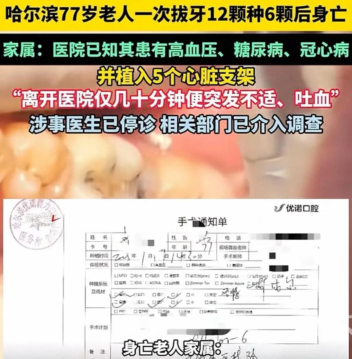 “拔牙丢了性命!可怜的老人种牙后再没说过一句话”! 近日,哈尔滨“77岁老人一次拔牙12颗种6颗后身亡”让人惋惜。涉事医生已停诊,涉事优诺口腔门诊已停业。7月31日,黑龙江卫健委回应:已介入调查,如有违规将及时公布。 据死者家属女儿说,其77岁的父亲患有高血压、糖尿病、冠心病,植入了5个心脏支架,一次性被拔除了12颗牙齿,当天又种植了6颗牙,当天抢救无效死亡。 牙科诊所这波操作太恐怖了!这事儿医患双方都有问题!为什么这么说?理由如下: 1、牙齿连着很多神经!年轻人也不敢一次拔12颗牙再当天种植啊!这样的牙医为了赚黑心钱真是胆大包天?不顾老人是否有病,毫无安全风险意识,拔牙到种牙理应有很多步骤,常规来说,拔牙后牙龈敷消炎药都要几天,怎么可以当天就种植新牙?所以老人致死,这牙医医院负有最大的责任。 2、稍微有点健康常识的人都知道吧?作为患者和患者家属,就医前也应该了解拔牙和种牙的风险,不应该选择小诊所,就医前应该储备常规的牙齿修复常识。都77岁了,身体还有那么多疾病,干嘛要选择种牙?应该等牙齿自然脱落后,戴一口假牙不就行了吗? 3、补牙、种牙是暴利行业,牙齿健康事关每个人,补牙相对比较便宜,但是种植牙就贵了!正规牙科诊所种一颗好的烤瓷牙就8000元左右呢,身边同事种了2颗牙,花费16000元,时间经历差不多一个月!拔牙、消炎去除牙神经要去几趟至少前后一二十天,最后才是种植牙。别说种植牙了,我曾经补过牙的残缺就前前后后去了诊所五六次。这是每个消费者应该了解的常识吧? 所以,正规专业的牙科诊所都知道,如果种植一口牙至少需要几十万元呢!但治疗种植过程至少需要一个月以上的更多见,分多步骤操作就是为了确保安全。而不是当天拔牙当天种植!哈尔滨这个牙科诊所为了赚快钱黑心钱,不顾老人是否有病,当天拔牙当天种植不要命才怪, 不规范的牙科诊所应该关门! 网友:拔牙真的会要命的,我妹去年拔了三颗牙,回家不久就住了ICU三天,抢救过来了,黑心的牙医是该整治啦!