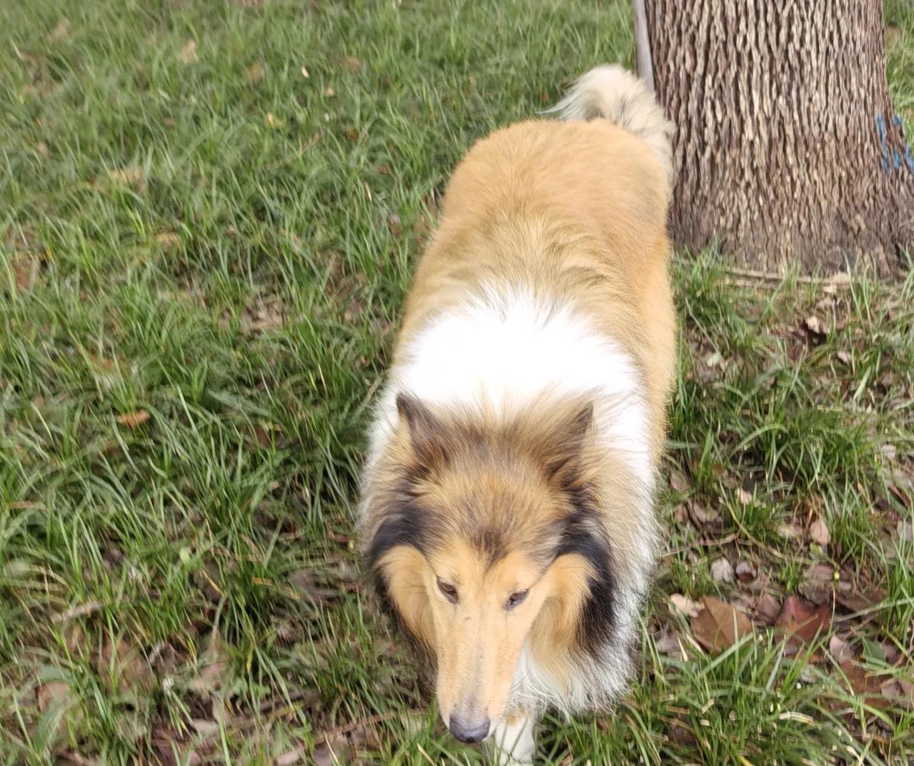 半路遇到一位帅哥,带着他的狗狗出来遛弯。 这狗狗浑身有着长长的毛,金色、白色还有