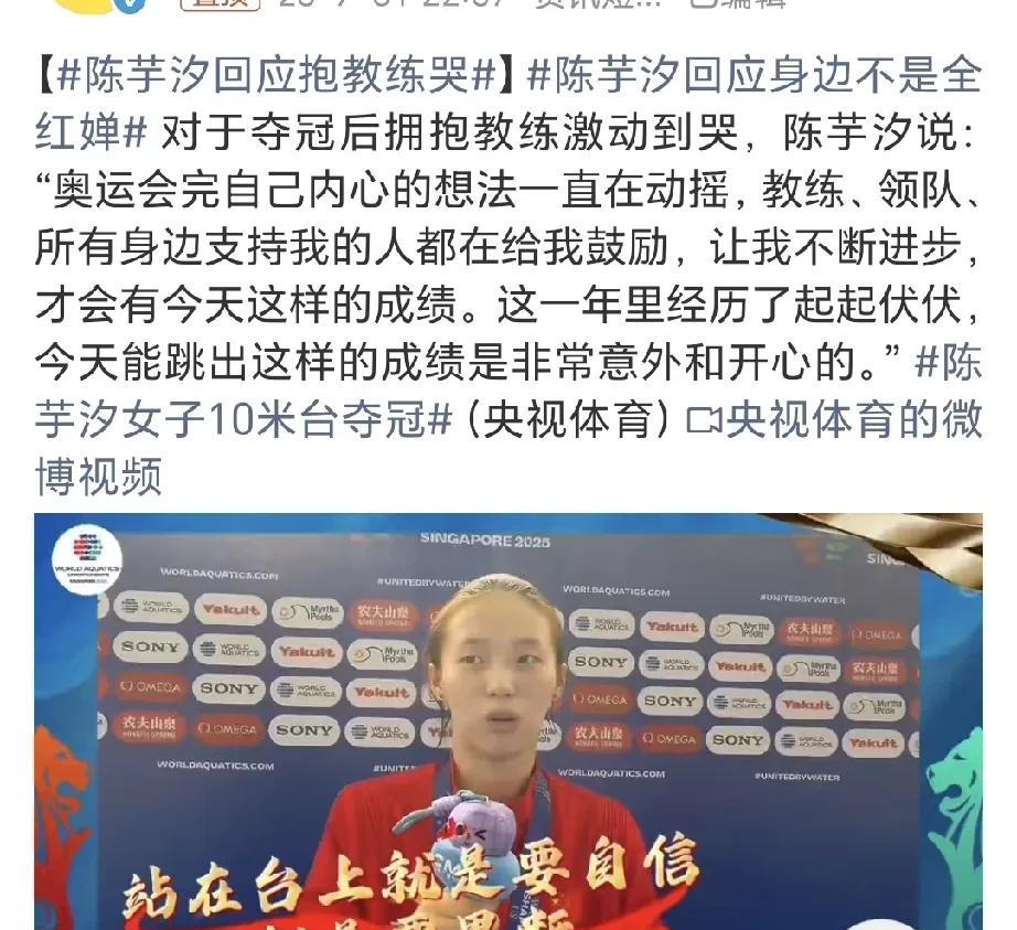 #分享城市新鲜事#陈芋汐赢了比赛后哭了,这背后肯定藏着不少情绪吧。想想看,运动员为了比赛要付出多少汗水,日复一日的训练,克服伤病和压力,夺冠的那一刻,所有的委屈、努力、激动可能一下子就涌上来了,眼泪大概是释放,也是对自己的肯定吧。 她说小红不在,她压力挺大的,所有的压力都给她了!