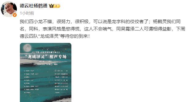 龙字科演员迎来专场了?德云社教导主任杨鹤通发布了“龙成泽灵”相声专场的演出安排。