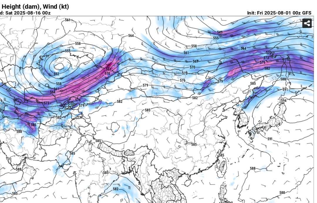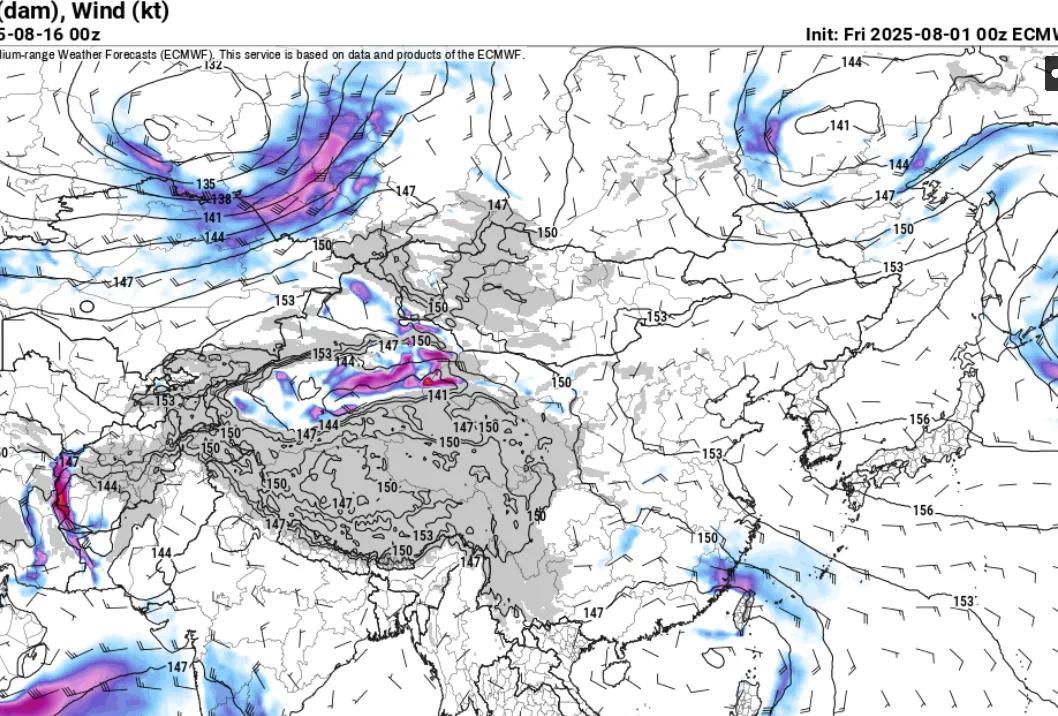 副热带高压这么靠北吗? 根据最新的15天数值预报,8月16日副热带高压感觉比较明