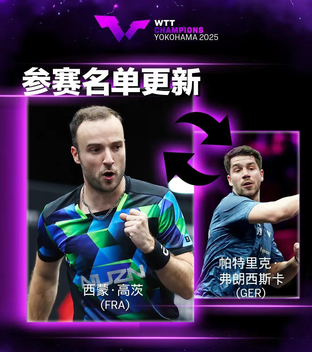 横滨冠军赛参赛球员变动, 梁靖崑退赛, 薛飞递补参赛, 帕特里克·弗朗西斯卡退赛, 西蒙·高茨递补参赛。 看来梁甜甜的腰伤还有些严重, 目前还不适合参赛, 退出比赛也是迫不得已, 毕竟身体健康更重要, 甜甜好好休息, 尽快把身体调养好, 瑞典大满贯更需要你! 弗朗西斯卡退赛, 据说是因为妻子生孩子, 弗朗西斯卡选择陪在妻子身边, 尽到做丈夫和爸爸的义务, 好有责任感和家庭感! 当生活和事业产生矛盾, 身体健康和事业出现矛盾, 不管运动员做出怎样的决定, 我们都会尊重他们的选择! #晒图笔记大赛#