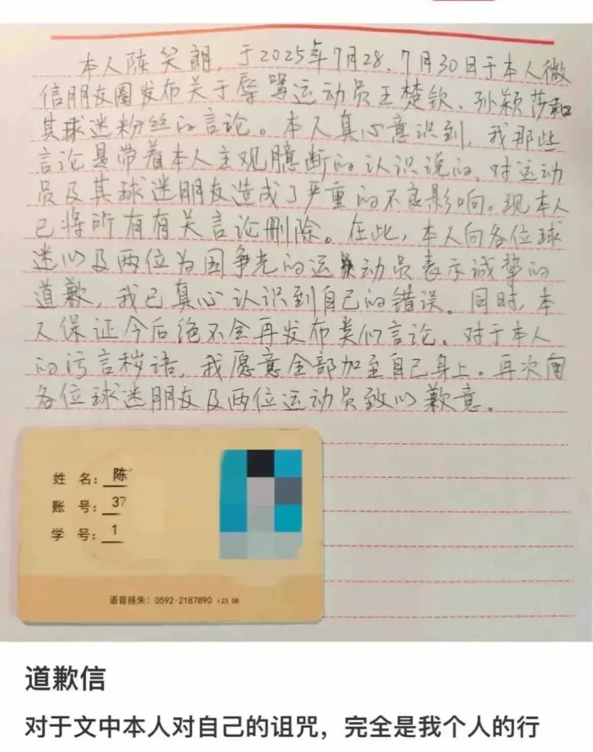厦门大学学生朋友圈辱骂王楚钦和孙颖莎的事可以说彻底打了厦门大学的脸。看了他朋友圈发的原文,句句话都是脏字,可以说这书是真的读到狗肚子了。 按理说能作为大学志愿者去乒超赛场素质都应该是不差啥的。你的诉求是志愿者公司欠你们的工时和工资,你找他们怎么要,怎么沟通那都不过份。但是爆粗口骂到运动员的身上,还一句接一句就是过份了。更重要的是从名字就开始谩骂直到技战术。看了他的朋友圈原文,似乎他应该是高水平运动员的大学生,要不然他不会提到去学技术。 他文件提到他是继科粉,提到爱屋及乌跟继科友好的运动员他都喜欢。所以看到他的骂人内容里提到王曼昱,林诗栋,都在他骂的范围内。当然王楚钦孙颖莎是首当其冲被骂的最惨的不共戴天的那个。这就很明显的他是什么粉了。亏了继科早就退役不在国乒队里打球了。