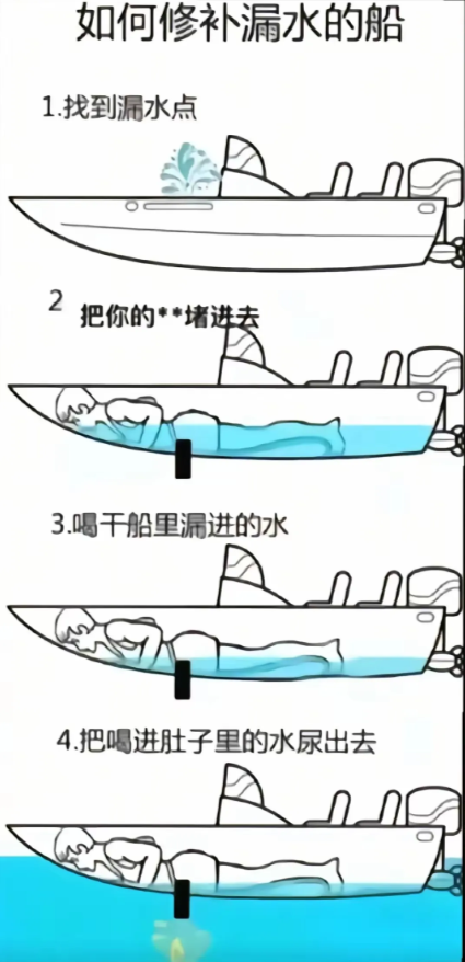 无言独上西楼 2 2025-08-02 11:51 喝光船上的水你还等不到尿出来就挂掉了。有个更好的建议,把你的xx堵进去,变大,喷出胶水把漏洞补上,这就很牛掰啊。如果是女生,什么都不用做,带上一只舔狗就ok了,这是最好用的工具啦[鼓掌]