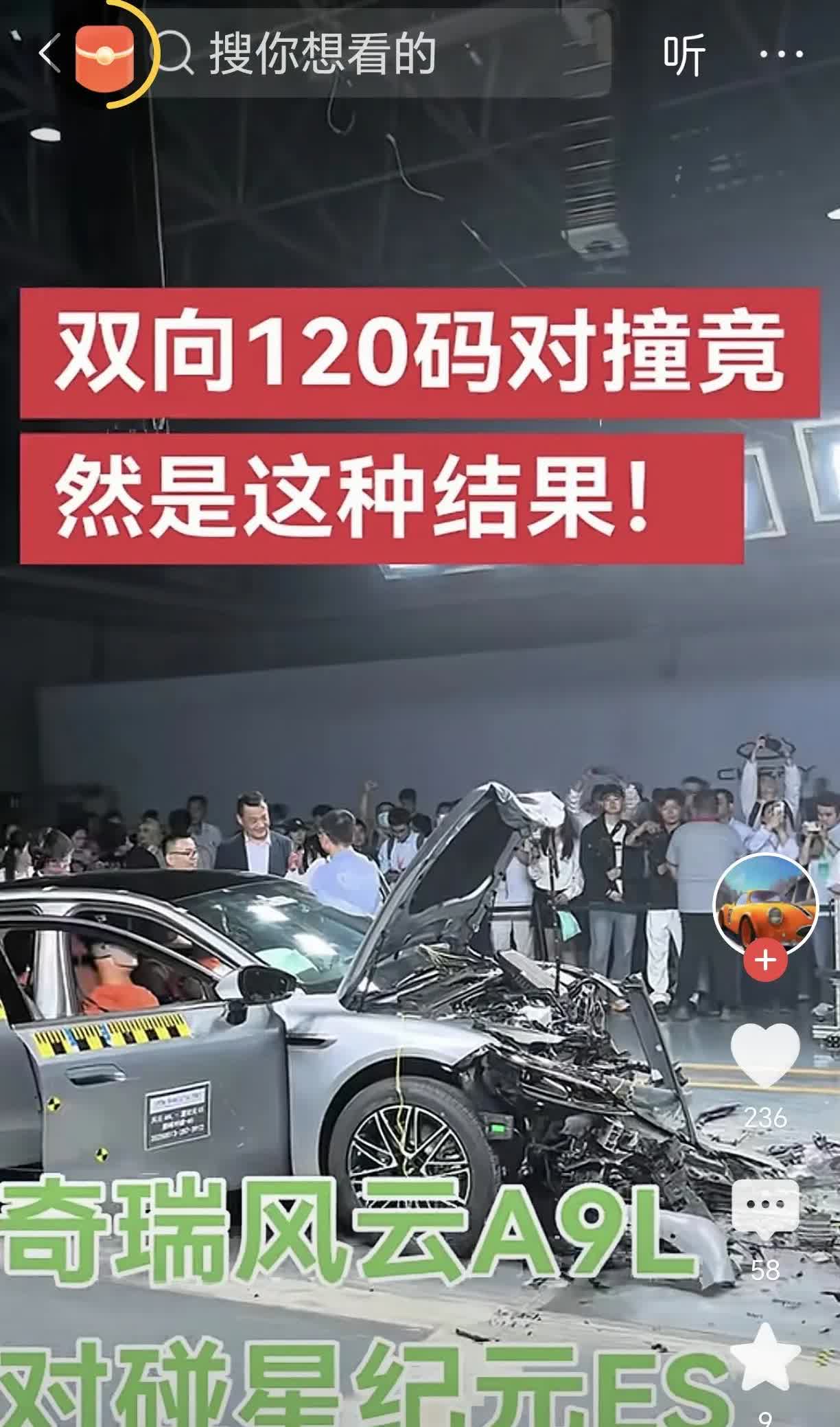 奇瑞公司用自家的两台车以120迈的速度进行对撞试验,这两台车分别是风云A9L和星