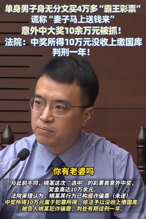 7月29日报道,上海,单身男子身无分文,一口气买了4万多元的彩票,想空手套白狼,结果因迟迟不付款,被店主识破报警。男子悲剧了,不仅意外中得的10万余元奖金被没收上缴国库,自身还被以诈骗罪,判处有期徒刑1年! 上海最近发生了一件让人觉得荒唐的事情,有个单身男人身上没什么钱,可他心里还想着靠买彩票一夜翻身,他打的主意是:先让彩票店把票打出来,等中奖了拿奖金再补钱。 可他没想到,计划根本行不通,事情败露之后,他一分钱没拿到,最后还因为诈骗被判了一年牢,更讽刺的是,那批他赊账拿走的彩票,真的中了十万多块钱,可这奖金直接被认定是违法所得,全部收走,一分不剩。 事情是在上海虹口区的一家彩票店发生的,那天快要关门的时候,这个叫姚某(化名)的男子走进店里,一进门就开口要打四万六千块钱的彩票。 他看上去衣着普通,却态度很淡定,还跟店主说钱一会儿就转过来,店主一开始犹豫,毕竟这么大的数额不是小事,可姚某一直催,说快停售了,让他先打票,说中奖了还会分他点好处。 店主抱着侥幸心理,觉得说不定这人真有钱,咬咬牙就给他打了票,票开出来后,姚某把近百张彩票全都扫进包里,说自己马上去确认转账,最多半小时钱就到。 结果半小时过去了,钱影子都没见,店主打电话催,他一开始还说在处理,后来干脆关了机,店主这才明白自己遇上了骗子,赶紧报了警。 警察很快找到了姚某,面对证据,他一开始嘴硬,说是银行延迟转账,但警方查了他的账户,发现他卡里只有几十块钱,半年多都没有进过大额资金,也没有老婆,完全是编出来骗店主的。 最后他只好承认,自己就是想先拿到彩票,万一中奖了再拿奖金去付钱,其实他以前就用这种手段在别的地方骗过彩票店,还因为这个坐过牢,2022年才刚出来。 最戏剧性的是,就在警方调查期间,这批赊账拿走的彩票真的中奖了,奖金十万多块,可这钱并没能让他翻身,因为按照法律,所有通过犯罪行为得到的财物都要被追缴。 这些奖金和犯罪直接相关,所以全都被收走,上缴国库,一分也留不下,等案件到了法院,法官认定姚某的行为属于诈骗。 他明明没钱,还假装能付款,甚至编造了“老婆转账”这个谎言,就是为了骗取价值四万多的彩票。 虽然因为报警及时,他的计划没完全得逞,属于未遂,但仍然要负刑事责任,最后法院判他有期徒刑一年。 店主出庭作证时说:“我自己也有责任,当时就不该抱侥幸心理,结果他想白拿彩票,我想做成大单子,最后我们俩都栽了。” 这件事告诉人们,想走歪路、想一夜暴富,最后的下场往往就是这样,不仅没捞到便宜,还会把自己送进监狱。 信源:大象新闻