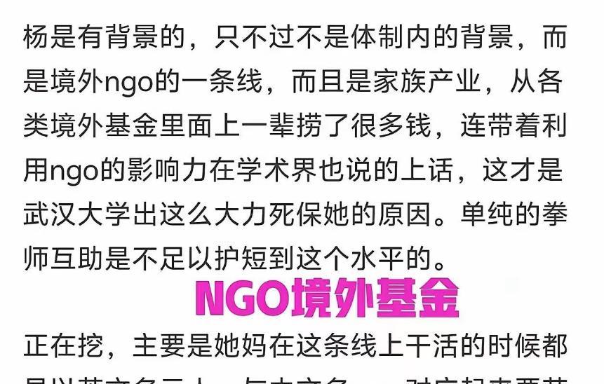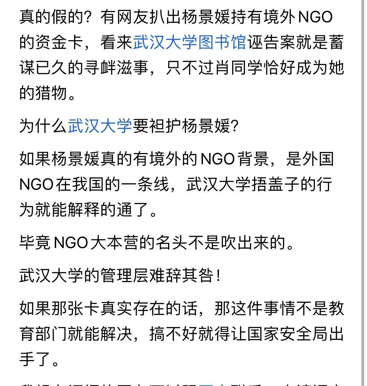 真的假的?杨某媛又被爆出大瓜!再一次刷新了网友的认知! 随着杨某媛事件在网上持续发酵,杨某媛又被网友挖出更多恐怖的细节。看来此事绝非用“坏”来形容杨某媛了,与肖某的矛盾是她蓄意为之。 很多人不明白,一个女孩为何要诬赖一个19岁的男生且穷追不舍?看来这事不是简单的诬赖了,而是故意制造事端和对立,为女权开道。 据这位网友透露,杨某媛貌似参加了境外的NGO组织,这个组织就是女权组织,背后由西方的资本操控。 细思极恐! 杨某媛有一张银行卡,是长城银联公务IC卡, 这个卡一般人无法申请,只有ZF、事业单位、国企或符合条件的民企员工,可通过单位部门申请。 如果她真有这么一张卡,足以说明她的身份不一般! 其父母可能为了转运钱财或挖光钱财而特意办的这张卡,他们的心早就倾向西方。 难怪这件事,武汉大学一直不发声,可能杨某媛真的有境外NGO背景。 如果那张卡真实存在的话,这不是学校能解决的事了。 也难怪武大校长说,肖某事件,学校正在处理中,至于何时会公布结果,还要等上级的安排。 本来就是一个处分的事,为何要听上级安排呢?看来这话真有深意。 如果真有境外势力为她撑腰。这真不是武大的能力范围了,估计要请国安部了。
