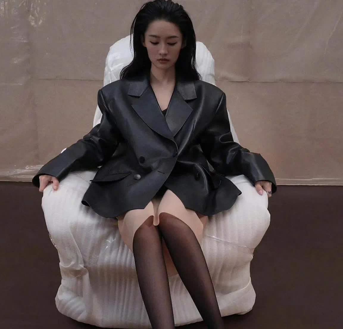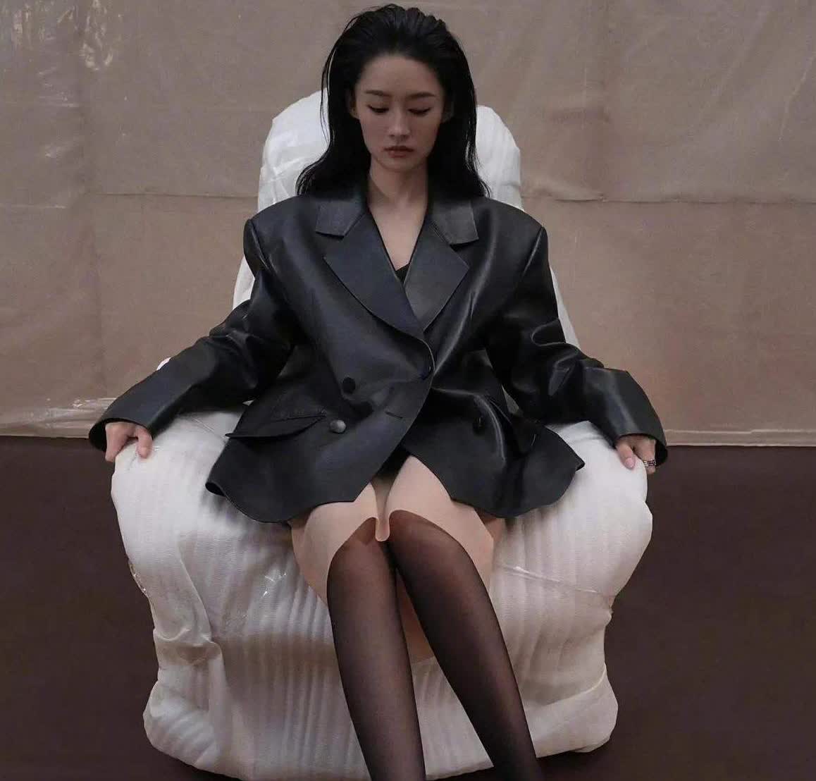 李沁身穿黑色皮外套搭配半身裙黑丝,这也太时尚显气质了吧
