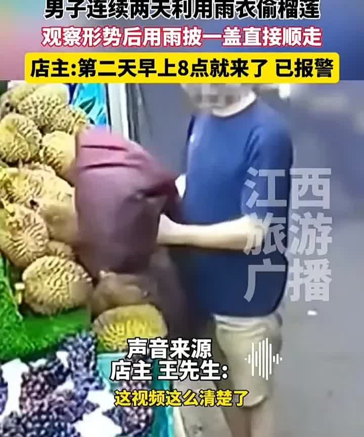 脸都不要了!7月31日,江苏南京一名男子趁着下雨之际,连续两天都穿着雨衣去一家水果摊,趁着摊主不注意时,直接偷走榴莲藏在雨衣里,摊主事后查监控才发现,该男子大约40多岁,造成损失近500元,目前已报警处理。 看到这名男子连续两天运用雨衣遮掩偷走两个榴莲的举动,真的令人感到无语。这名男子太糊涂了,想吃榴莲可以大大方方向摊主购买,而不是去做一些不法之举,这样不仅给摊主造成了损失,自己也将面临处罚,实在是太不理智了。大家怎么看呢?