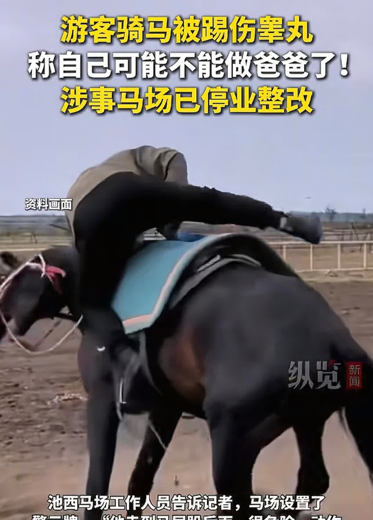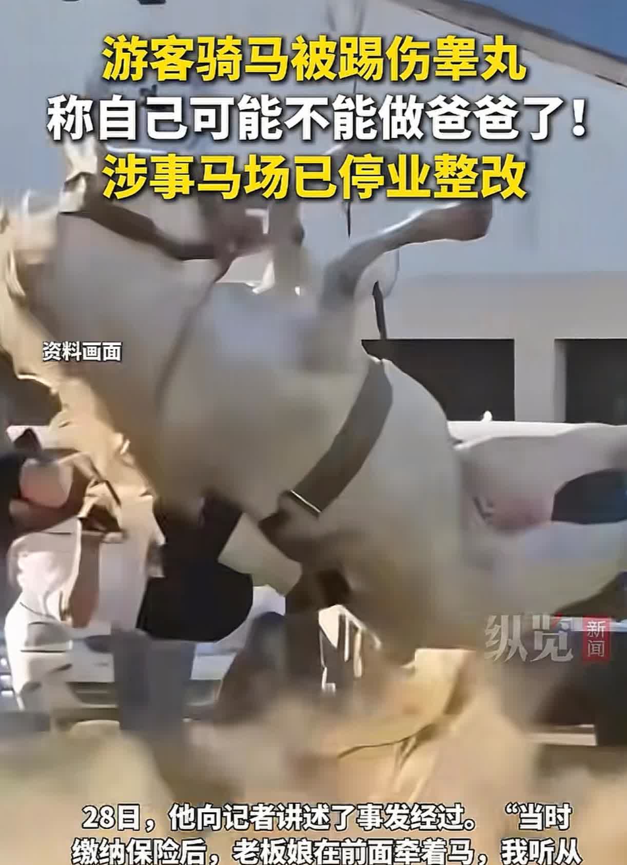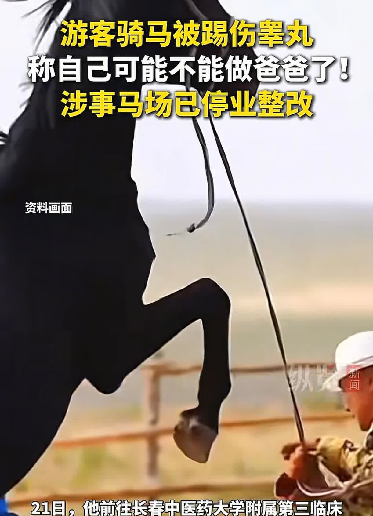 看着都感觉痛!吉林长白山一名游客在一马场准备骑马时,被突然惊吓的马儿踢伤睾丸,男