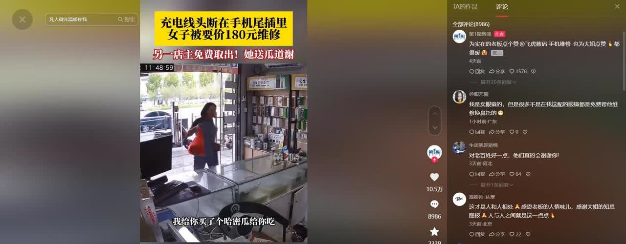 “两个实在的人双向奔赴!”江苏,女子充电器突然断在手机里,别的店铺要价180元。女子觉得太贵,朋友知道后,带女子去了一家常去的维修店,岂料,店主的做法让女子又吃惊又感动!网友:实在人遇到讲究人! 9月12号那天,江苏有个姑娘一边充电一边玩手机,结果不小心把充电头给弄断在手机里了。她自己鼓捣半天也没弄出来,只好出门找修手机的地方。结果一连问了好几家店,都说得换主板,要收180块,明明就是个小毛病,被他们说得跟大工程似的。姑娘心里犯嘀咕,但又没办法。 后来她朋友知道了,就带她去了自己经常去的一家小维修店。店主接过手机,也没急着要钱,先仔仔细细看了看,然后用个镊子轻轻一夹,就把那断头给夹出来了。姑娘心里直打鼓,生怕店主狮子大开口。结果店主笑了,说:“这点小事儿,不值啥钱,也不用给钱。”女子当时说不出话来,心里又感动又吃惊。她赶紧说要给钱,可店主却笑着摇摇头说:“修好了就行,这样我心里也踏实。”女子感激不尽地走了,但心里一直惦记着店主的好。 过了几天,她特意抱了个哈密瓜来店里,说是要谢谢店主。店主一开始不要,但看她那么坚持,最后还是收下了。 就是一次小小的修理,两个实在人,却让彼此心里都暖暖的。店主的真心换来了女子的感激,女子的坚持也让这份善意有了回报。这种你来我往的真心,可能就是人与人之间最美好的感情吧。