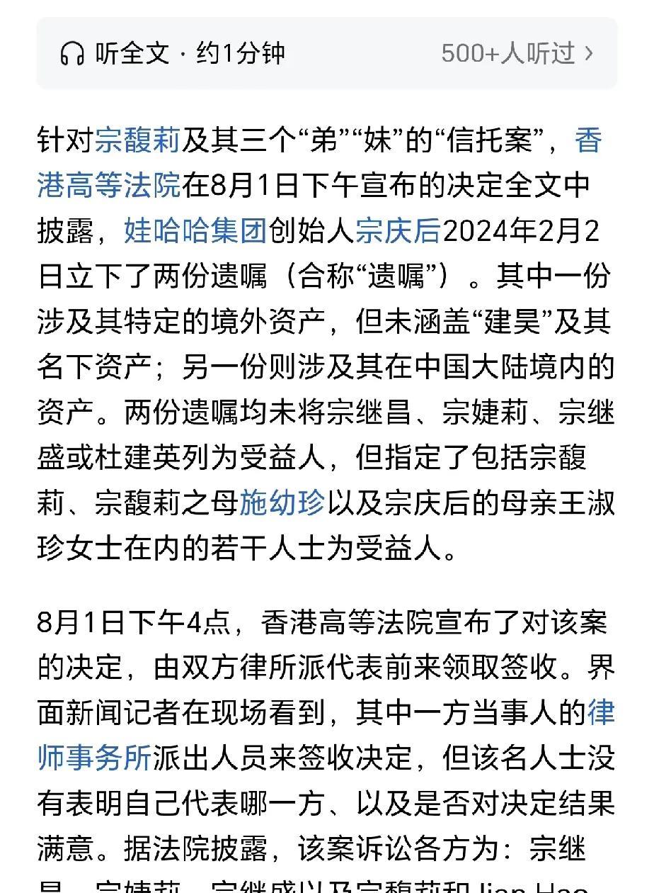 幸亏宗老之前提前立了遗嘱,要不然宗馥莉失去的可不是仅仅21亿美元的信托基金。 根据现有资料,宗老在2024年立了两分遗嘱,里面涉及的宗老遗产都没有把杜建英和三个孩子列为继承人,而是把宗馥莉和母亲施幼珍还有宗庆后的母亲列为继承人。有了这个遗嘱,最起码保证了娃哈哈是宗馥莉继承了。 假如没有宗老的遗嘱,那么根据私生子也有继承权的法律,宗馥莉失去的不只是21亿美元,而是宗老的遗产,甚至宗馥莉都不能独掌哇哈哈公司。 其实现在问题已经很清楚了,就是宗老留下遗嘱,让大女儿继承自己的公司和主要遗产,而三个私生子给她们留下了21亿的信托基金,这个信托基金还是和宗馥莉达成了协议的,宗老想的很全面了! 不过宗老的这个协议到底有没有法律效益不得而知,因为毕竟宗老和施幼珍可能都没有离婚,他不可以自己处理夫妻共同财产,所以21亿美元信托基金,到底应不应该判给杜建英的三子女,期待后续的消息!#头号创作者激励计划#
