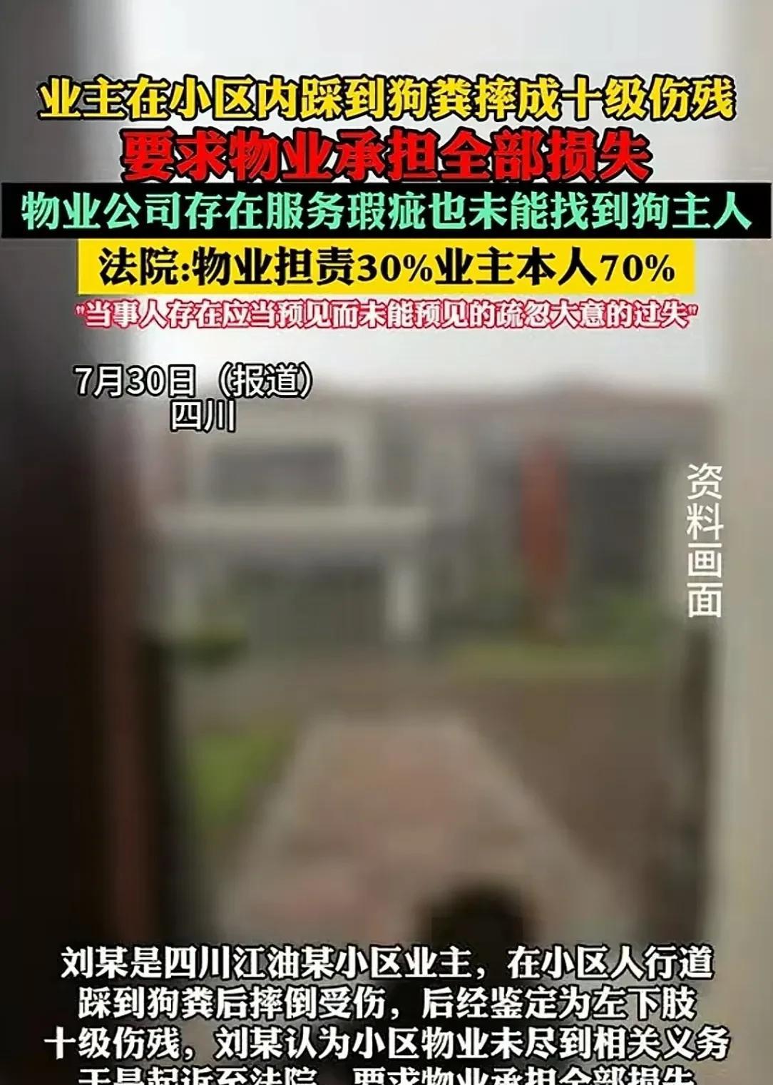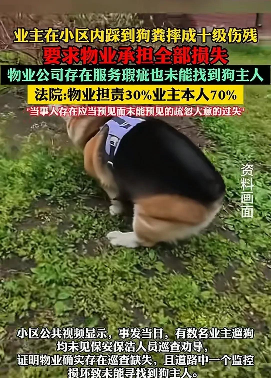 四川江油,男子在小区的人行步道行走,踩到一坨新鲜的狗屎,男子并没因此走狗屎运,而是被摔成了10级伤残。因没有找到肇事狗的主人,男子认为,物业没有及时清扫人行道的卫生,更没尽到保障业主人身安全的义务。因此将物业起诉到法院,要求物业承担因受伤所产生的全部损失。物业也不是软柿子:自己走路不小心,逮谁怨谁?然而,法院判决,出乎所有人的意料! 7月30日,据极目新闻报道,某小区业主刘某,在小区步道上踩了一脚狗粪,滑倒摔伤后,被鉴定为左下肢伤残十级。 他认为,不光狗主人要对此负责,小区物业也跑不了,因没有找到肇事狗的主人,刘某将物业起诉到法院。 事发当天,刘某准备外出,他在小区的人行便道上行走时,一个不留神,脚下一滑后仰摔倒,疼的他直冒冷汗。 突然一股刺鼻的臭味儿在身旁散发,刘某仔细一看,原来自己是踩上了一坨新鲜的狗屎。 这一跤可摔的可不轻,都说走了狗屎运,刘某却被这一坨狗屎害的疼痛难忍。 这可真是倒霉透了,刚出门儿就摔了一跤,还是被狗屎害的,这得有多尴尬? 他看看四周没人注意,想赶紧爬起来,离开这个倒霉的地方,可他一动疼的呲牙咧嘴,左腿一点劲都使不上了。 看来这是摔坏了腿,刘某赶紧联系了家人,被紧急送去救治。 刘某这一跤摔伤了左腿,之后住院治疗,经鉴定为左下肢十级伤残。 俗话说,伤筋动骨一百天,刘某为此花费了不少医疗费,还耽误了工作。 事后,刘某认为,作为业主,自己按时分文不少的交纳了物业费。 小区保洁,应及时提醒养狗的业主,不要让狗在人行便道上随便拉尿。 更应该及时清扫,人行便道上的卫生和障碍物,保证业主的行走安全。 自己被狗屎滑到,肯定是保洁人员做的不到位,现在狗主人没有找到,物业应对自己的的摔伤,负全部责任。 不过物业倒是挺会甩锅,保洁上午 8 点 56 分清扫路面,可11点就有好几个业主在附近遛狗。 物业只收物业费不办事,监控坏了都不修,这回算是自讨苦吃。 事后,刘某将物业公司起诉到法院,要求其承担,自己滑倒导致伤残的全部损失。 法院经过调查认为,小区人行便道,物业安排有专门的保洁定时清扫。 且刘某行走的前方,有老人小孩儿都已安全通过,并没有发生任何危险。 刘某之所以踩到狗屎,是他没有自己没有注意看的脚下的路。 导致没有合理的避开那摊狗屎,直接踩中后被滑倒摔伤。 也就是说,趋利避害应当是人的本能,每一个人都是自己安全健康义务的第一责任人。 刘某本来是可以避开,而没有避开,是他自己的问题,其存在重大过错,应承担主要责任。 而物业也不是没有错,保洁人员,是早上8点多对人行步道进行清扫的。 但是一上午的功夫,又有多名业主,在人行道路旁遛狗。 保洁人员并没有再次清扫,也没有保安劝导遛狗的业主,应远离人行步道。 因此造成人行步道上堆积了狗屎,存在导致刘某滑倒受伤的危险。 更重要的是,这一路段的监控早就坏了,物业没有及时更换维修。 导致事发时,找不到肇事的狗,所以物业存在服务瑕疵,应承担次要责任。 现在的人走路只盯着手机,明明是自己的错,非要找个垫背的,有枣没枣打一杆子再说。 踩到狗屎,居然找物业,如果撞到电线杆子,那不是要找电业局的麻烦吗? 不过物业平时收费的时候挺积极,这时候倒装聋作哑了,保安巡逻是摆设,保洁清扫是作秀? 偏偏关键位置的监控是坏的,找不出狗主人是谁,业主交钱,就换来这样个服务? 这会,肇事的狗主人说不定在哪偷着乐呢。 那么从法律的角度来分析,如何看待此事呢? 《民法典》第942条:物业服务人应当按照约定和物业的使用性质,妥善维修、养护、清洁、绿化和经营管理物业服务区域内的业主共有部分,维护物业服务区域内的基本秩序,采取合理措施保护业主的人身、财产安全。 物业是负责小区公共区域管理和服务的,像人行步道就属于公共区域,物业安排了保洁定时清扫,算是履行了一定的职责。 但在保洁清扫后,没有及时巡查和处理新出现的狗屎,也没劝导遛狗业主,并且监控坏了没修,这就没有完全尽到保护业主安全的义务,所以要承担一定责任。 《民法典》第1173条:被侵权人对同一损害的发生或者扩大有过错的,可以减轻侵权人的责任。 刘某走路时没有注意看路,前面老人小孩都能安全通过,他却没避开狗屎而滑倒,自己存在疏忽大意的过失,对损害的发生有很大过错,所以要承担主要责任。 最终,法院酌定,刘某对于损害后果的形成,应承担70%的主要过错责任。 物业公司对导致事故损害后果的形成,承担30%的次要过错责任。 对于那些养狗人士,狗拉完屎就拍拍屁股走人,留下满地浊 物没人收拾,脏乱差全让小区邻居买单? 物业的监控一到关键时候就坏,狗主人溜了不追责,业主摔伤要负主责,这岂不是本末倒置? 对此你怎么看? 关注@赵哥的法律观 明辨是非不上当 #头号创作者激励计划#
