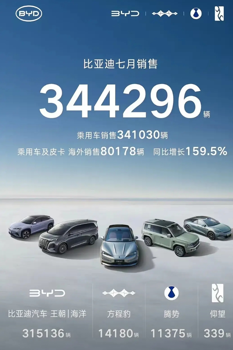 比亚迪的销量增长持续低迷,没有了去年的猛劲,7月销量只有34万多,同比微增0.5