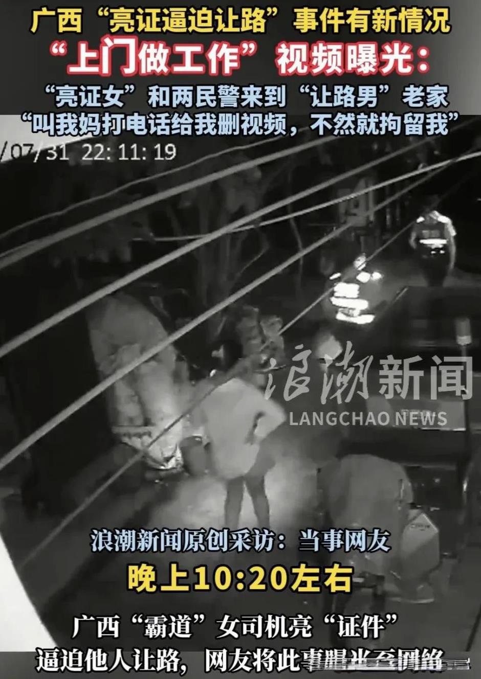 亮证女后续来了,如果没有猜错的话,现在应该正在被工作组安排谈话吧,刚刚当地回应已经展开调查了。 可以看到亮证女有点害怕,但是怕的不多,晚上十点多,领着两个民警去涉事车主的家里,威胁别人不删视频就把他抓起来,说是涉嫌违反治安处罚条例。 如果她诚挚道歉的话,说不定车主还会把视频删了,并且做一些解释。没想到这个亮证姐提出的要求那么过分,丝毫没有意识到自己的错误,让别人删除视频,还要发布视频道歉。 如果亮证女是公安系统的,应该是为人民服务的,受到人民群众监督的,而不是去威胁人民群众的。