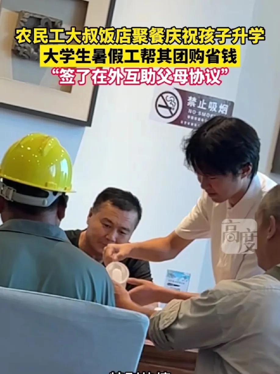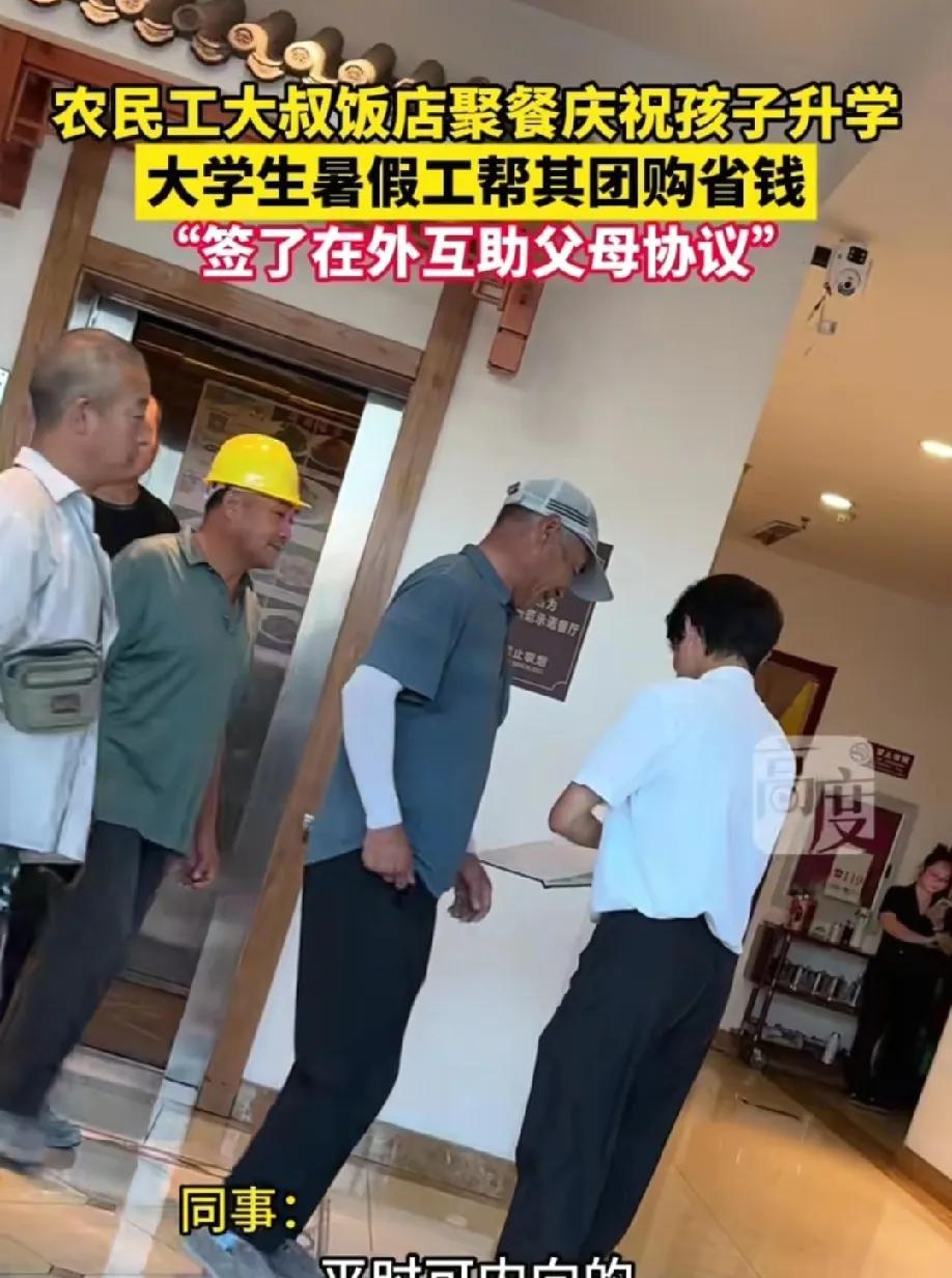 看哭了!北京朝阳饭店来了几位农民工大叔。饭店的暑假工大学生特别的热情招待他们,农民工大叔自己的孩子升学,所以带几个朋友来饭店庆祝一下。从口袋里掏出1000块钱,说:够不够? 暑假工说:够了,够了,不用这么多,男孩在手机上为大叔们点餐并为他们节省钱。 大叔非常感谢这位暑假工,给了小费,让他买一瓶水喝,暑假工说:不用,不用,这是我应该做的。 饭店的同事说:我们新来的这个大学生暑期工平时很内向。 今天对这几个农民工大哥特别特别热情,很上心。 暑假工说:自己签了“在外父母互助协议”,看着这农民工大叔,也让他想起了他的爸妈,帮助这些人就是他的义务。 网友:农民工要现金结账,暑期工帮农民工用美团券省了钱。农民工少花了钱,老板挣的少了,但这个老板没有不高兴,也挺难得的。 “在外父母互助协议”这就是一个梗并没有实质性的什么协议,很多人在网上说“在外面帮助别人就是帮助自己的父母”,所以很多网友都默认的签了这个协议,大家只要坐火车就会帮助一些老人,一起上火车。他们找不到车次,位置啥的。大家都会主动帮忙,因为我的爸妈也不识字,他们自己坐火车也需要帮忙。