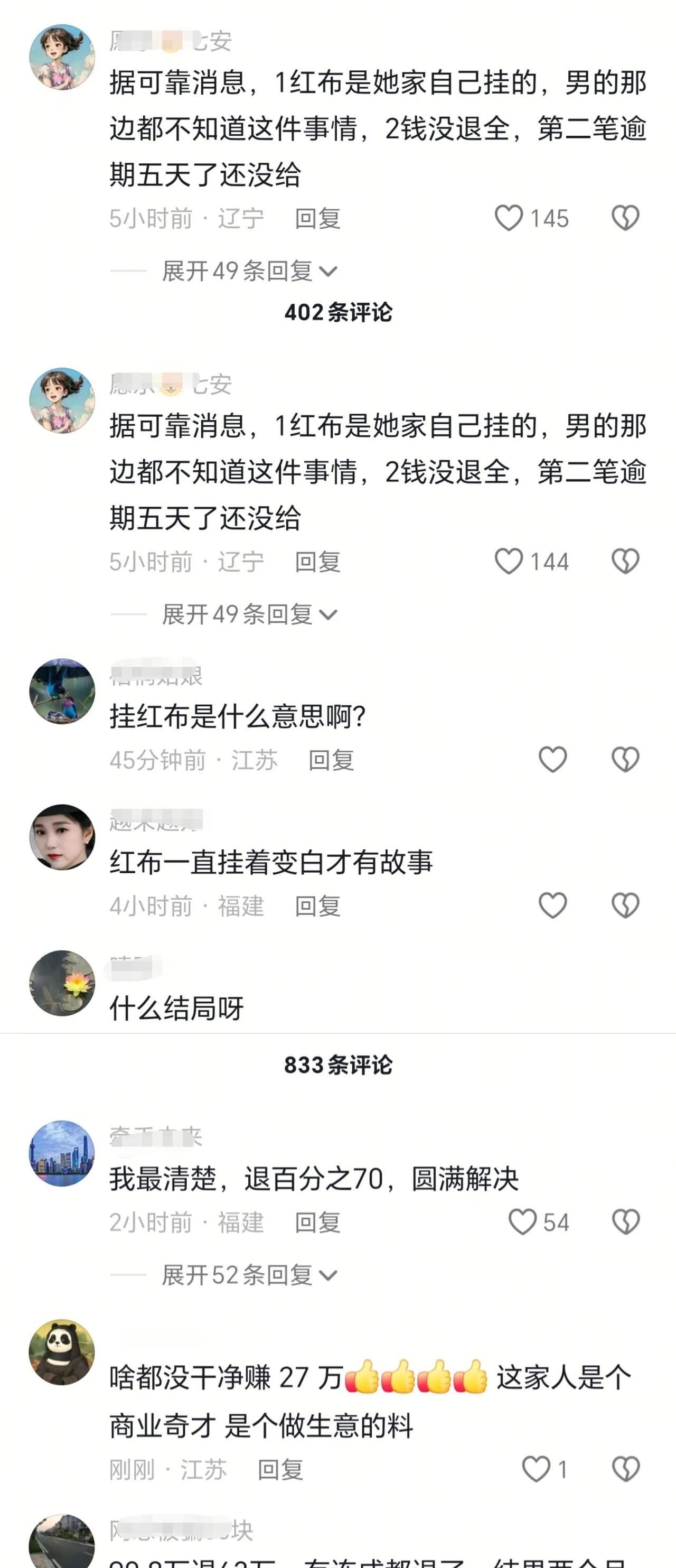 90.8万彩礼退还金额已谈拢,男方给女方道歉,送红布挂上,也有人说是女方自己挂的 不过这都不重要,双方对彩礼退还的金额谈拢了!事件圆满结束。 有好几个当地网友发视频,其中还有个像是女方亲戚,图1那位配图大概率是和女方家人有关,他发的视频有挂红布放鞭炮的场面,文案也有感谢当地调解,他还用本地话蛐蛐几句那些去蹭流量的博主(带有骂人的意思,我已抹上)。 在莆田这种情况下,挂红布一般是为了冲去晦、霉气,有人说是男方收到钱道歉挂的,也有人反驳是女方自己挂的。 这样的小细节一点都不重要!农村习俗而已,双方都好好的才是最重要的。 从各方给的信息来看(男方曾在上月24号左右发视频声明事情解决了),事件确实是圆满结束了,因为哪怕是反驳的网友,她也说彩礼退还金额谈拢了,有分歧也是在能不能按时还钱上。 毕竟就算是退7折,也要大几十万,女方也需要一个时间,去凑这笔钱。 这件事情结束后,男方父母估计不会再让儿子找当地姑娘,当地姑娘也知道他家借80万彩礼的事情,肯定是没几个愿意嫁。 女方就更不用说了,事情闹这么大,我一个在广东的莆田人,还经常刷到关于他们的视频,在老家的人就更不用说了,他们哪敢让自己孩子找这样的人呢,不是骗婚也不行。 女方只能在外自己谈一个外地的男友结婚生子。 个人觉得:这事情可以说是双输,谁也不是赢家,别以为女方就占便宜了,白得那么多彩礼,莆田彩礼高,很多时候是两个家庭亲戚之间资源互享,莆田很多农村抱团做生意就是这么来的。 大多数是女方沾了男方光,女方嫁过去后,男方会带女方小舅子他们一起创业。 从男方能借到80万来看,男方亲友团也是很有实力的,女方失去了这么一个亲家,在莆田当地人的眼中,自然算是输了。