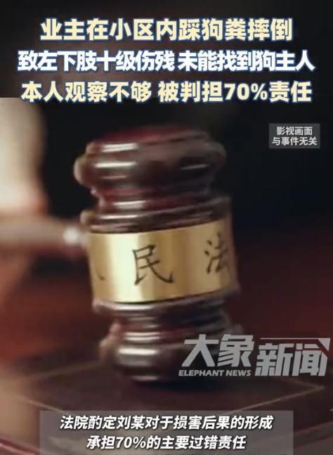 “真走狗屎运了!”四川江油,一业主早上出门散步,不料一脚踩到狗屎摔倒了,事后医院检查确认是十级伤残,然而业主找物业要监控时,对方却告知是坏的,气的业主将物业告上法庭,要求对方承担她所有的医药费,法院判了! 据大象新闻7月30日报道,谁能想到,出门散个步,竟然踩了坨狗屎,结果直接摔成了十级伤残? 听着像段子,结果这事儿真的发生了。 2024年1月7号,天气不错,刘先生想着出去透透气,沿着小区里的人行道慢悠悠地走着,哪知道刚走几步,脚下一滑,整个人摔的可不轻。 他当时就躺地上爬不起来了,等缓过神才发现,原来是踩上了狗拉的屎,滑倒的……真是气也气不过来。 他被紧急送医,一开始还以为就是扭伤或者骨裂,结果一检查,医生直接给他鉴定了是左下肢“十级伤残”。 这下刘先生彻底绷不住了,怎么也想不通,自己不过踩了一脚狗屎,怎么就摔成这样? 更让人火大的是,他去找物业调监控,想看看是哪位狗主人没清理,物业却说监控坏了,拍不到! 刘先生一肚子火:你们不是应该负责小区的卫生和管理吗?狗屎没人清理,监控还坏了,出事了你们一句“查不到”就完事儿? 刘先生把物业告上法庭,要求对方赔偿医药费、伤残补偿等一系列损失。 案件到了法院,法官可没全听他一面的说法,而是综合了现场情况。 法官指出,事发地是小区正常通行的道路,而刘先生是成年人,走路理应多观察路面。 更何况,在他摔倒之前,已经有老人和孩子顺利走过那个位置,并没有出事。也就是说,如果刘先生当时注意脚下,是可以避开的。 所以法院认定:刘先生自己对这次事故负主要责任,占比70%。 但物业也不是一点责任都没有,监控坏了是一方面,关键是那段时间内,保洁虽然在早上8点多扫过地,但直到上午11点,有不少业主遛狗,物业方面也没有人出来巡逻、劝导、清理。 这说明他们在日常管理上确实存在疏漏。 加上没有监控也找不到狗主人,所以法院判物业要承担30%的责任。 这事一传出来,网上议论纷纷。 有人说刘先生是真倒霉,一脚狗屎踩出个伤残。 也有人觉得法院判得有理:走路不看路,也得担点责。 更多人感叹:小事背后,其实是很多人都不重视的安全隐患。 信源:大象新闻