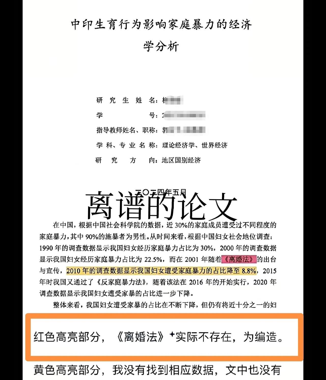 怪不得“李然于心”这么刚,很不简单啊! 猛把杨某某毕业论文里面的错误,以及数据涉嫌造假都找出来,因为他是华师大硕士,本身就很厉害! 大家知道华师大有多牛吧? 这可是教育部直属6所师大之一,那没点本事,怎么能考进去? 李然于心为了揭露杨某某论文涉嫌造假,已经发布好几期视频了,人家不是凭空杜撰,而是根据事实,有理有据来剖析! 杨某某的论文,知网上可以下载,因此不涉及泄露个人信息,李然于心则把有问题的部分标注出来,最离谱的一点是,杨某某竟然杜撰了一个《离婚法》,这就非常离谱了,她把相关法律名字弄错了,审核的人员呢?也没发现吗? 这种论文猛答辩过关… 好吧! 我无话可说了! 对了,让我们为博主李然于心加油! 他是勇敢的[赞] 还有,杨某某的论文课题是《中印生育行为影响家庭暴力的经济》 [灵光一闪] 这课题,我咋看不太懂呢? 学分析