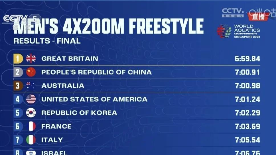 险胜00.07秒!眨眼功夫!中国拼得男子接力银牌 8月1日晚,世锦赛游泳项目继续进行,中国队参加男子4x200米自由泳接力决赛。 预赛,由费立纬、季新杰、汪顺、张展硕组成的中国队,总排名第六,晋级决赛。 中国队决赛阵容调整为季新杰、潘展乐、汪顺、张展硕。第七道出发。 中国队齐心协力,奋勇拼搏,以7分00秒91的成绩,险胜游出7分00秒98的澳大利亚队00.07秒,夺得亚军。冠军为英国队所获,成绩为6分59秒84。