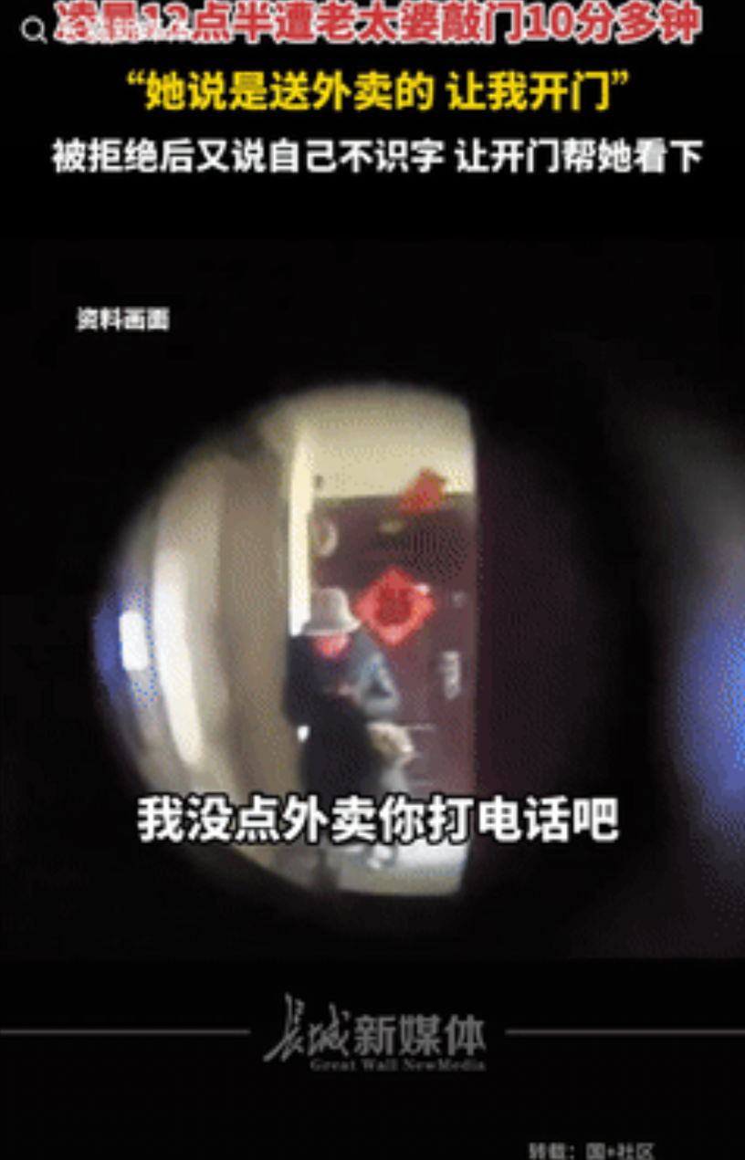 “细思极恐!”四川女生半夜听到敲门声,透过猫眼一看,发现是个全副武装的老太太,还说是送外卖的。可女生压根没点外卖,老太没穿制服也没拿东西。女子害怕不敢开门,谁料老太竟开始砸门,还说了一句让她汗毛倒立的话。女子分享网上后,有知情网友庆幸没开门,不然就完了! 7月24日晚上12:39分,四川女子已经洗漱休息了,可是突然听到门外传来一阵激烈的敲门声,原本女子以为可能是邻居的门在响,因为自己家就自己不可能有其他人来,所以就没有在意。