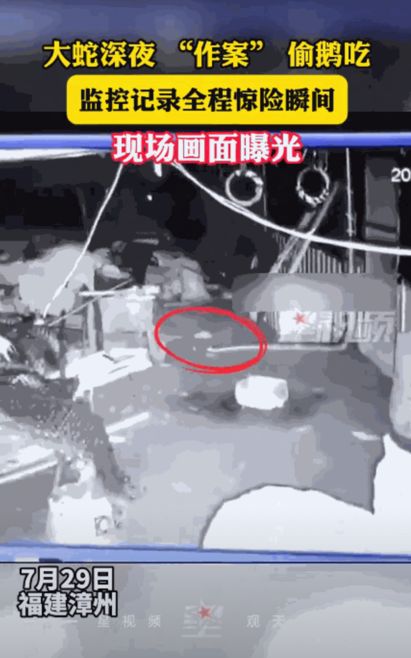 “太可怕了!”7月29日,福建漳州,男子发现家中的大鹅少了2只,以为被小偷给偷走了,急忙调监控查看,结果看到恐怖一幕!大鹅被一条3米多长的蟒蛇吞入腹中,而吃饱喝足后,蟒蛇就又溜走了。网友:不是说养鹅能防蛇吗?
