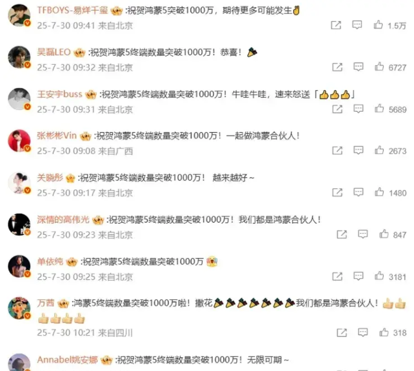 不是因为鸿蒙5终端数突破1000万的时候,易烊千玺、关晓彤、万茜、单依纯、严屹宽竺一众明星发文祝贺,虽然这也是一个信号:Android是看不上的,iOS早就看着添堵了。