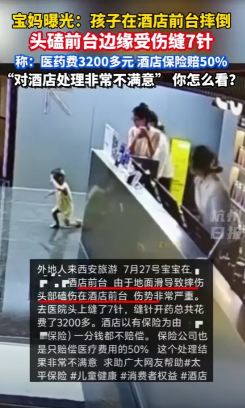 “冤不冤!”7月27日,陕西西安,一孩子在酒店独自玩耍,不小心在前台摔倒,头磕到前台边缘,受伤缝了7针,而孩子妈妈却认为孩子在酒店受伤,酒店要担责,保险赔偿50%,对酒店处理结果非常不满意,网友:为什么要讹酒店?